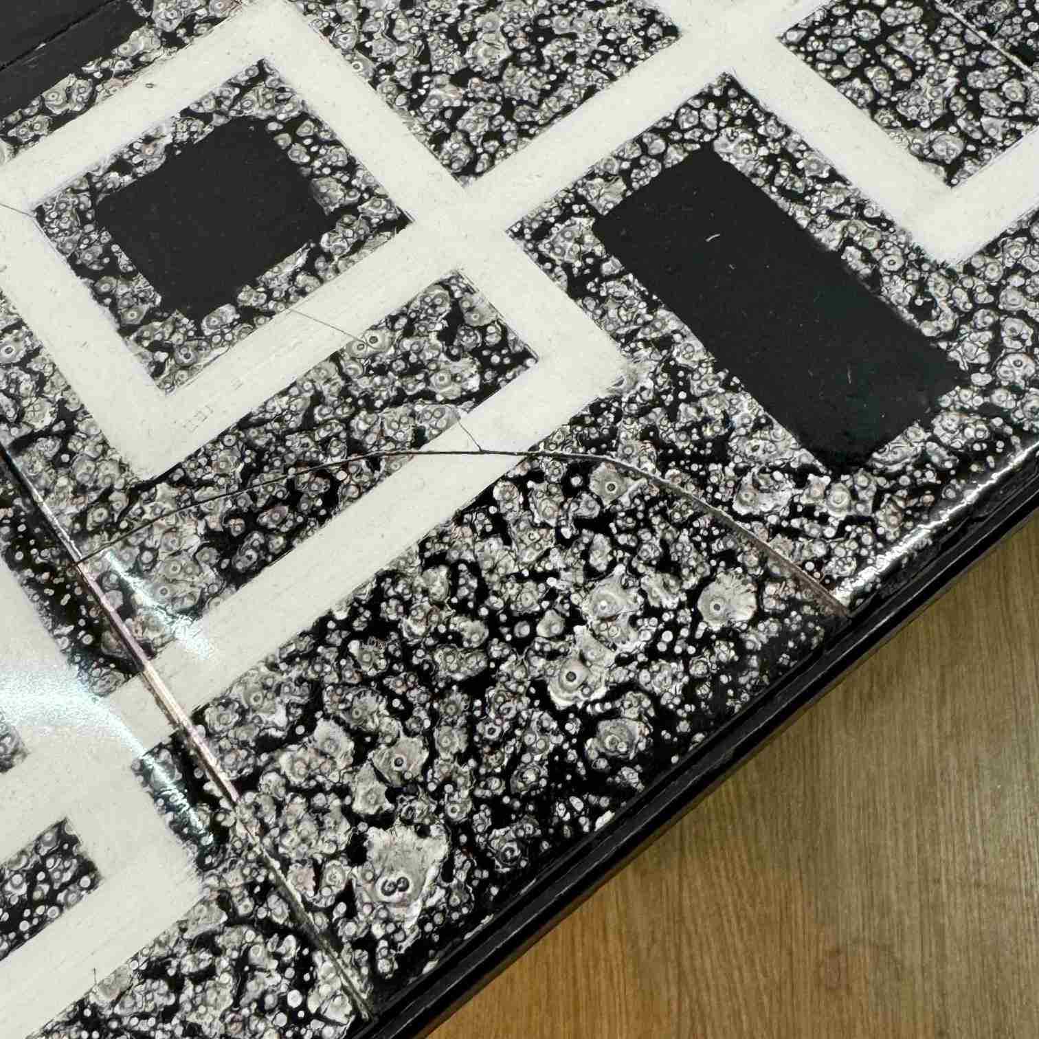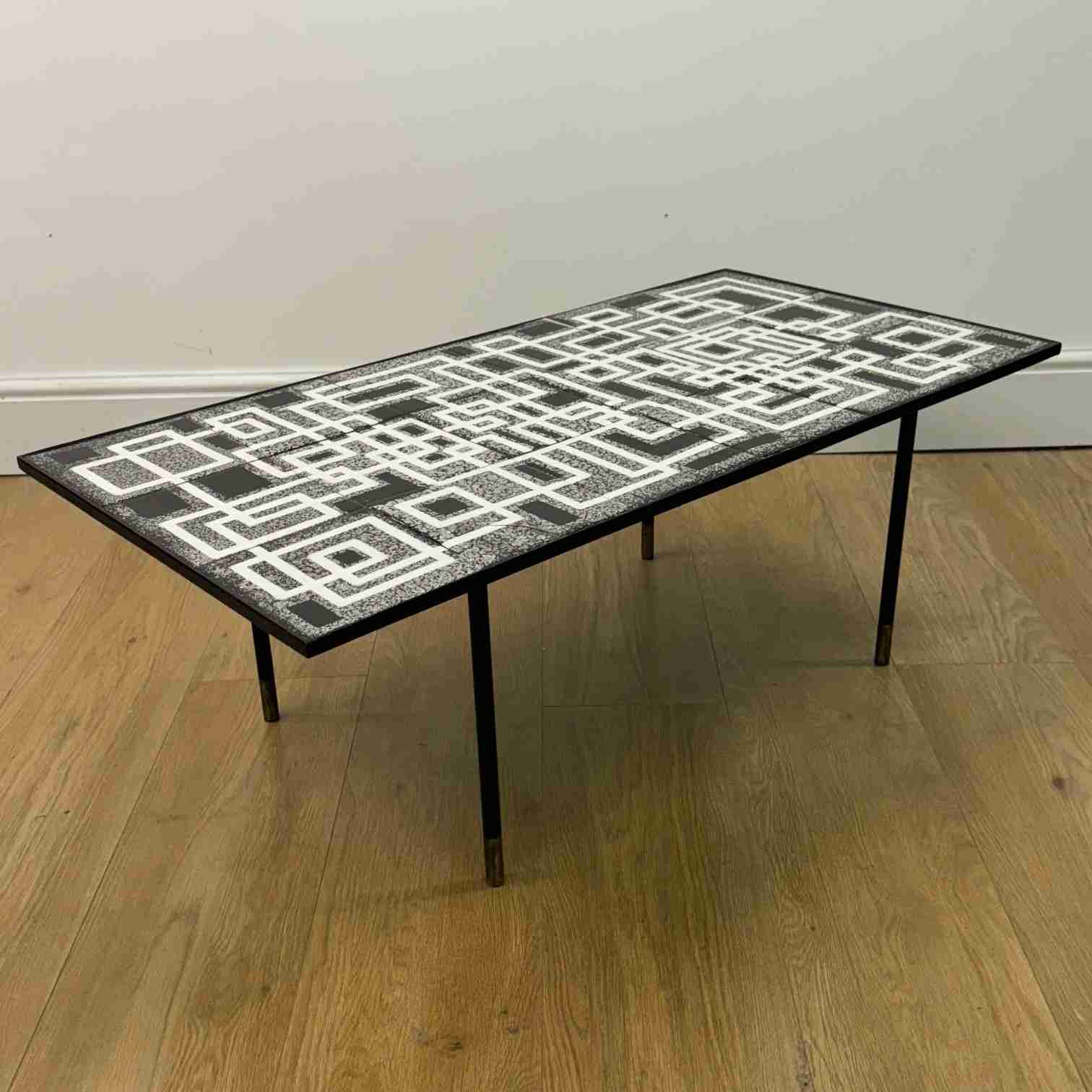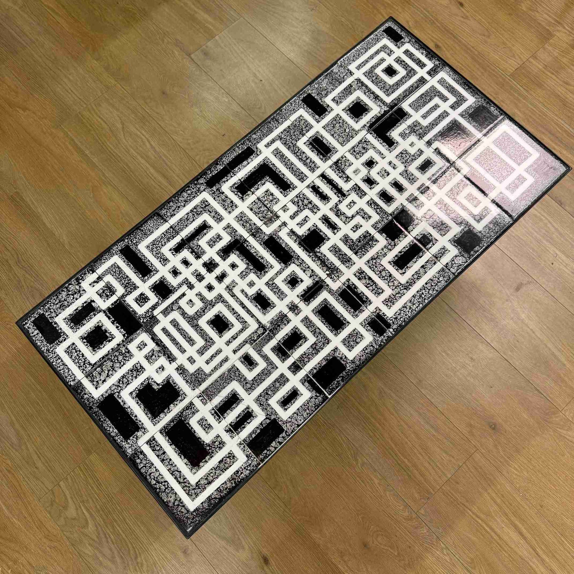 A striking 1950s low coffee table with black and white geometric design tiled top
