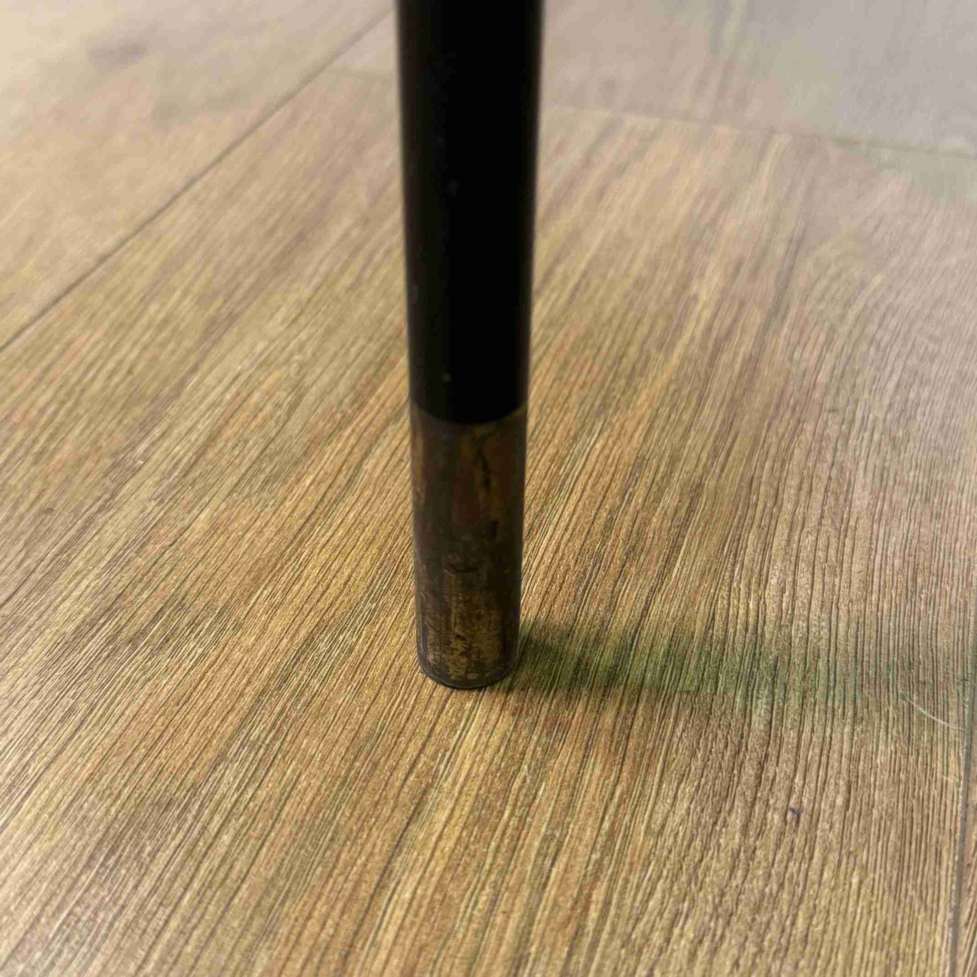 stands on black painted steel legs with brass finials