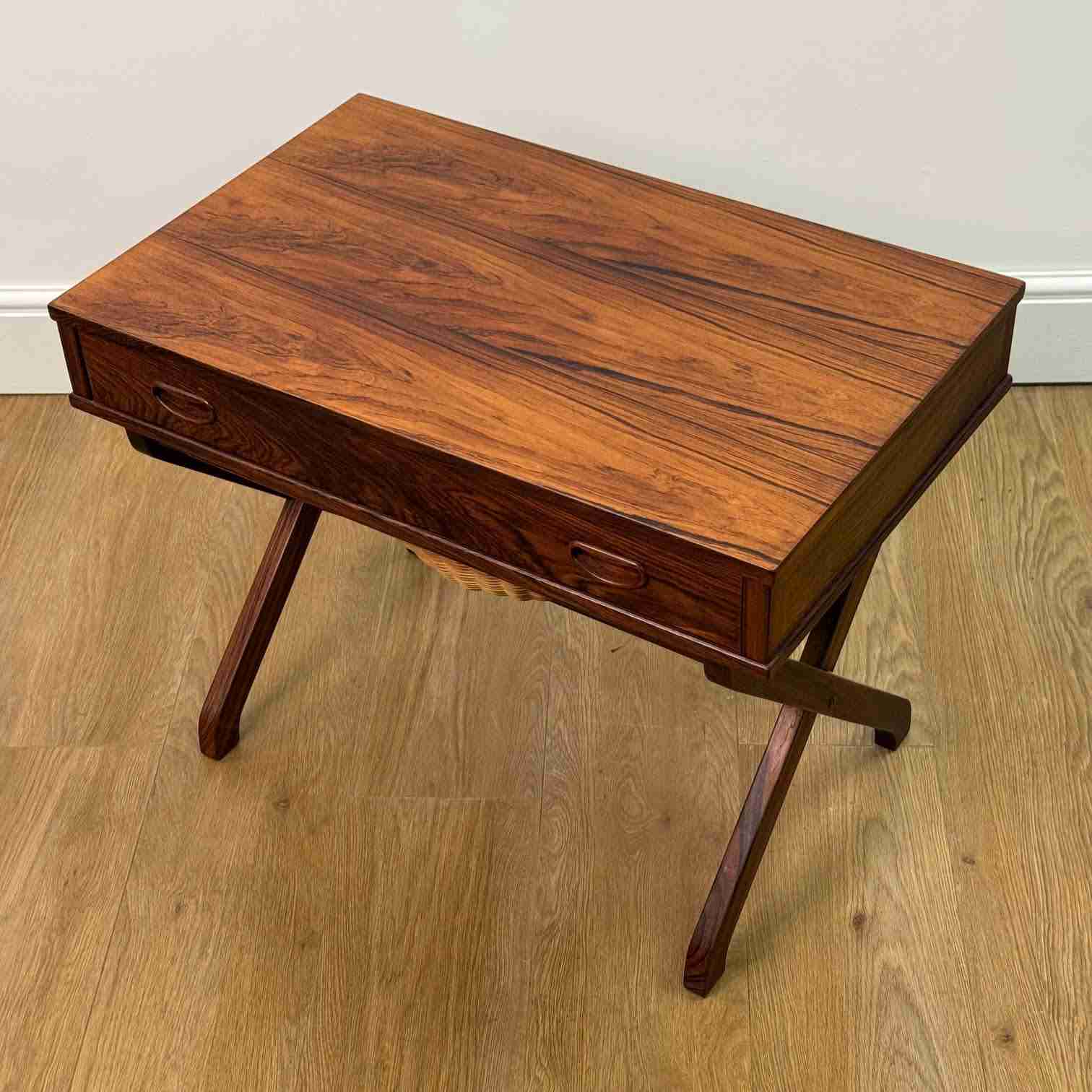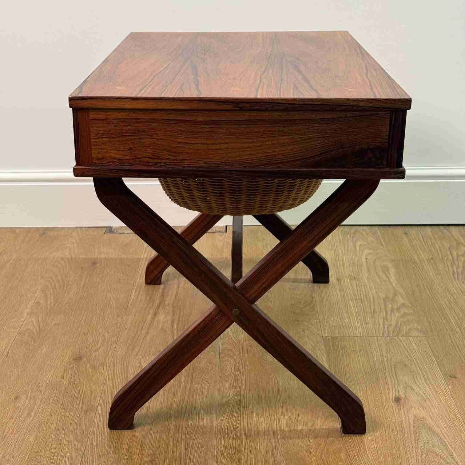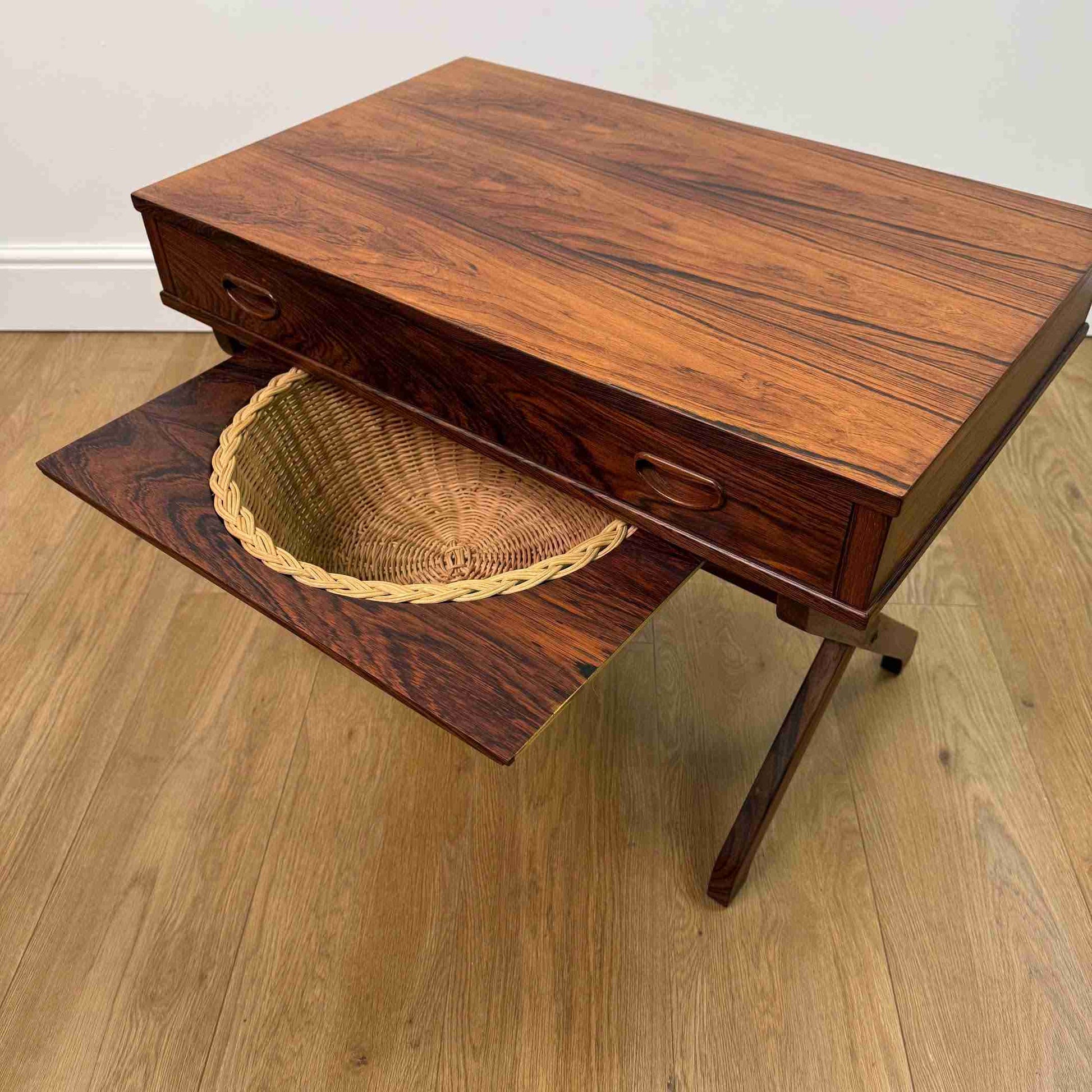 A lovely rosewood veneered sewing table on x frame legs from the 1960s