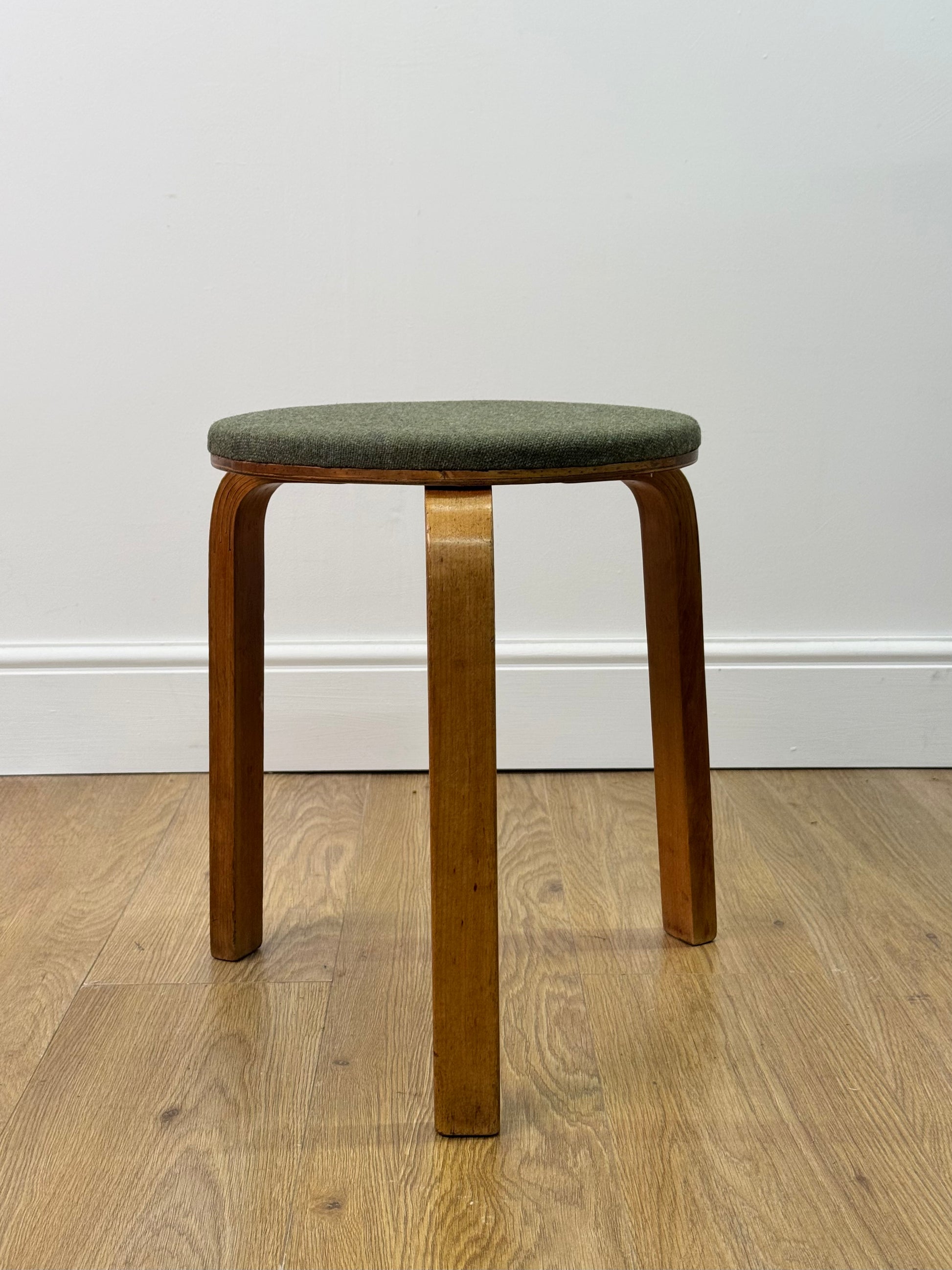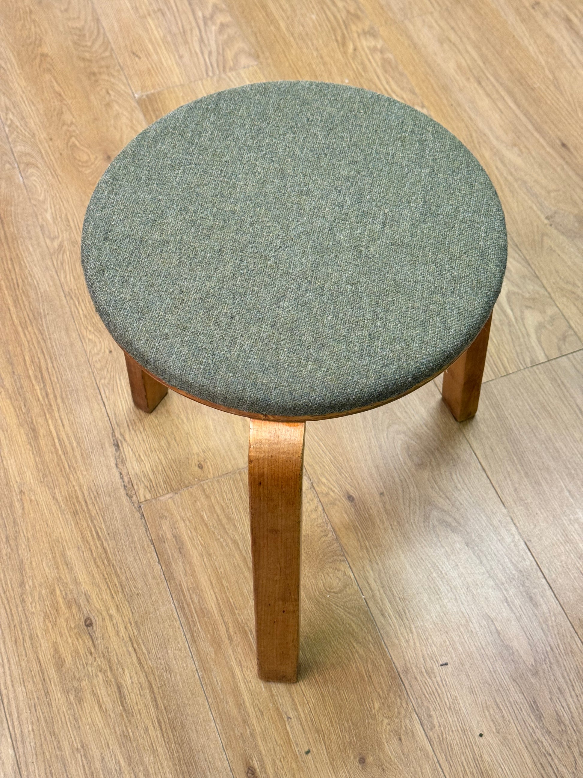 an early example of Aaltos classic stool with 3 legs and upholstered seat with characteristic half upholster on the side