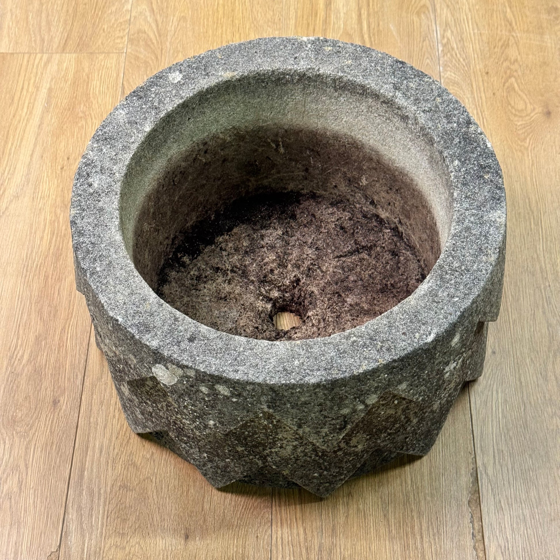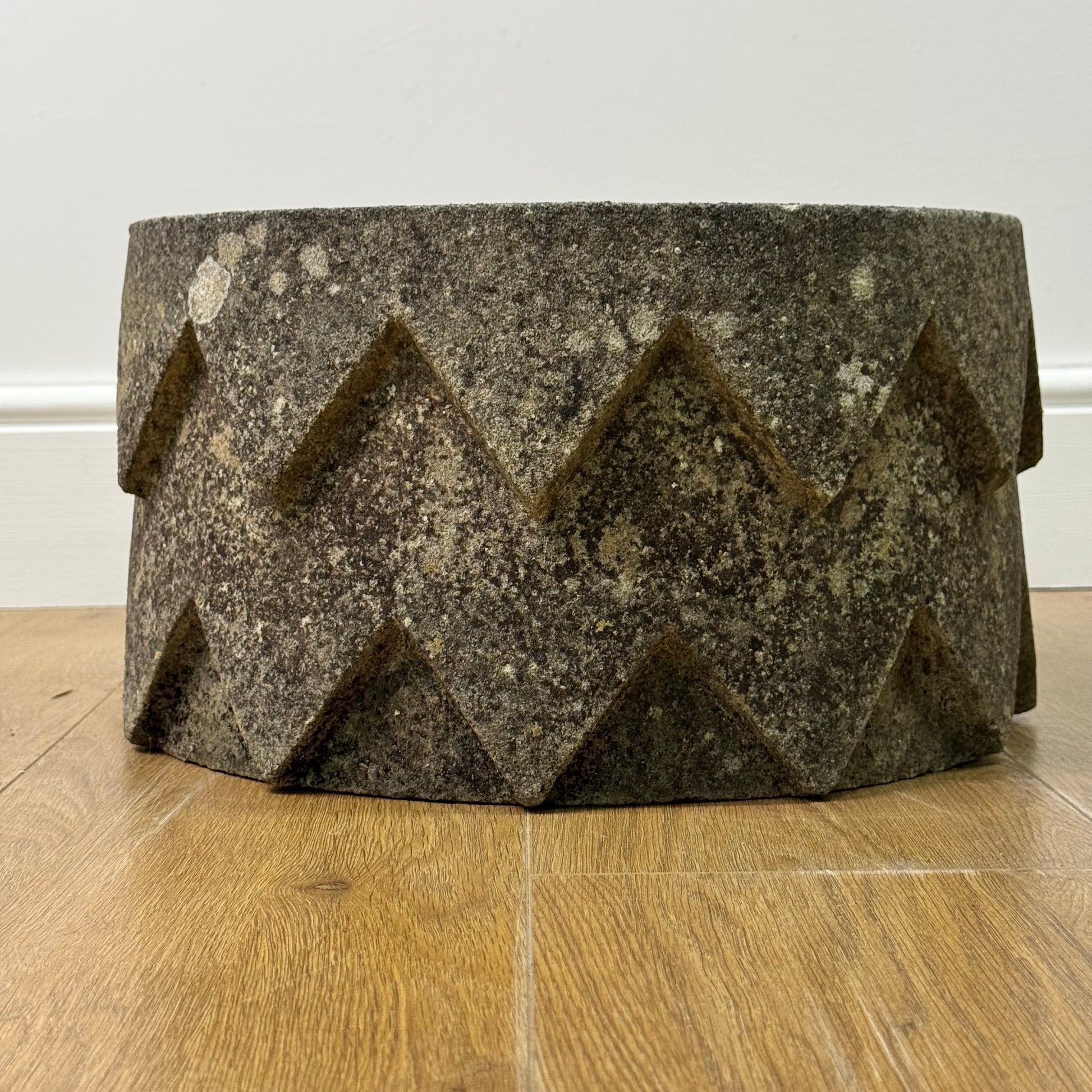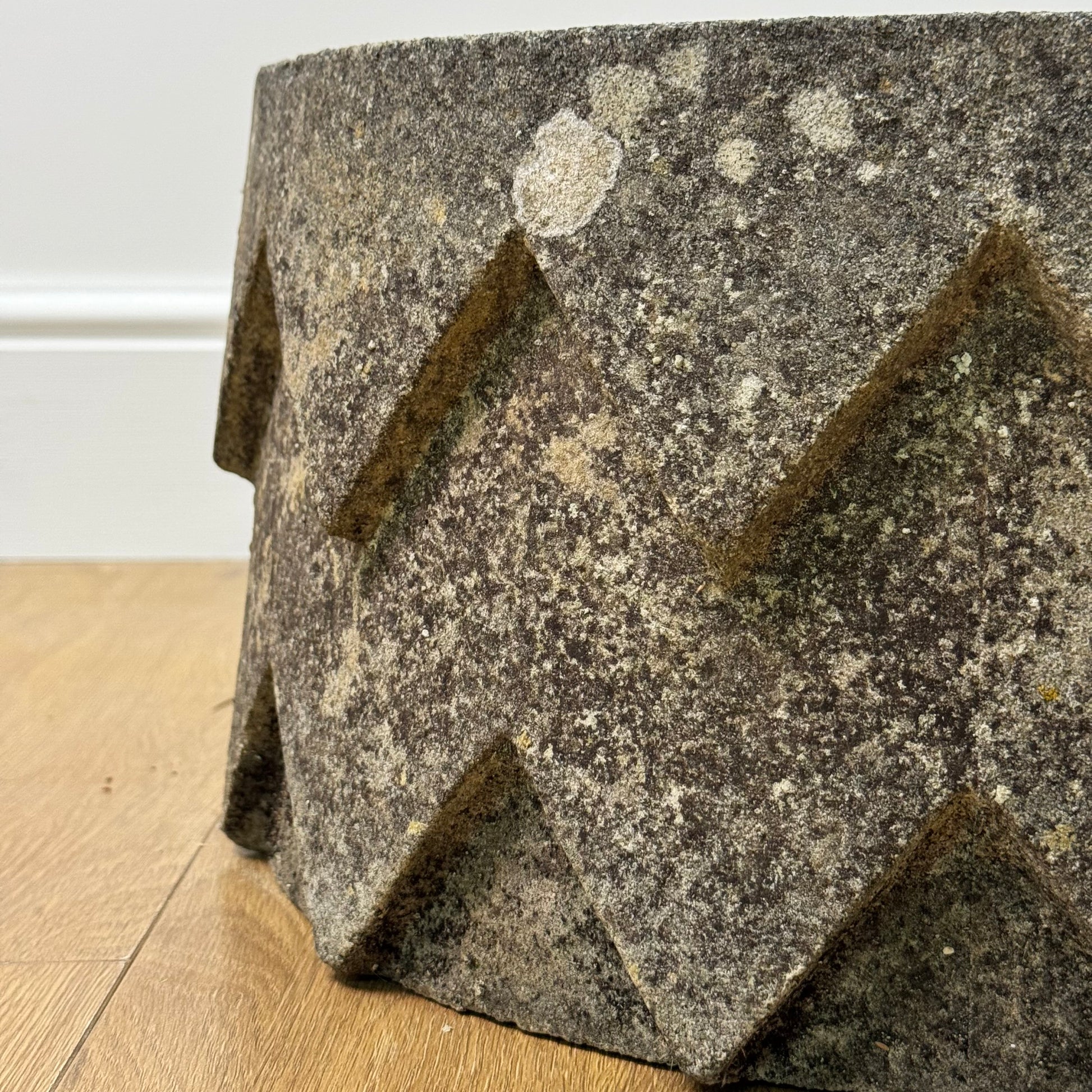 Art Deco style reconstituted stone planter with zig zag decoration to the outside.