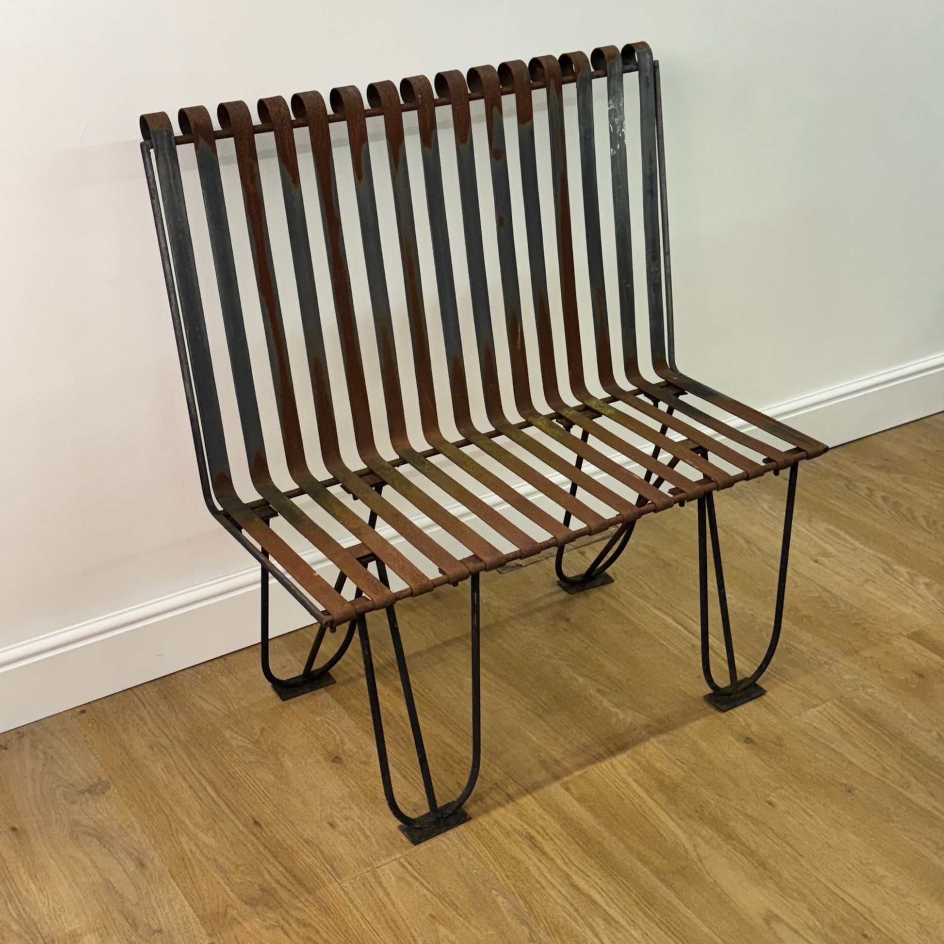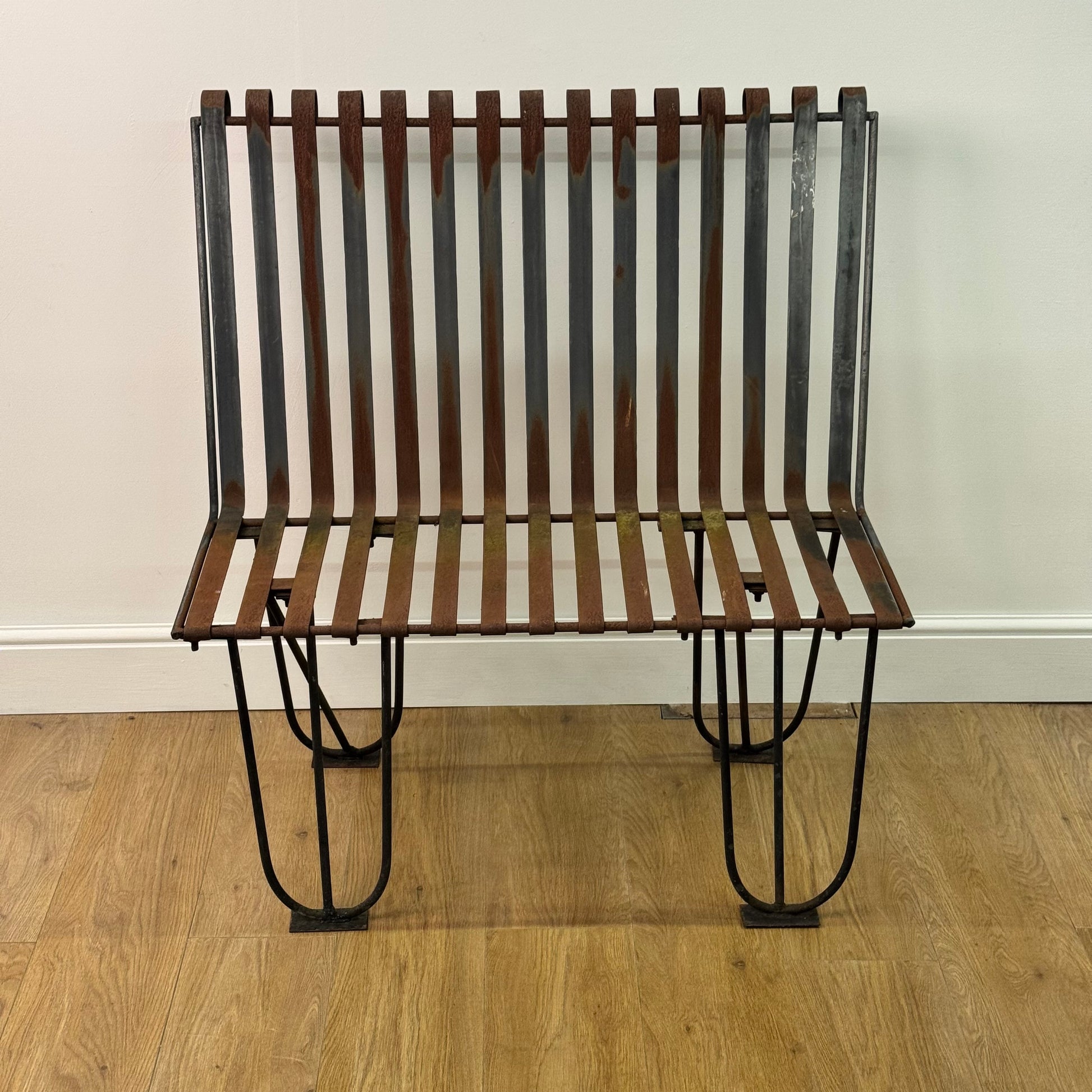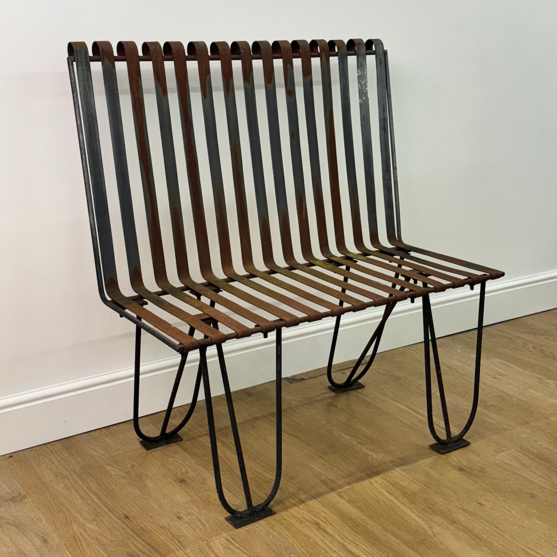 An unusual small galvanised slatted steel bench on hairpin style legs