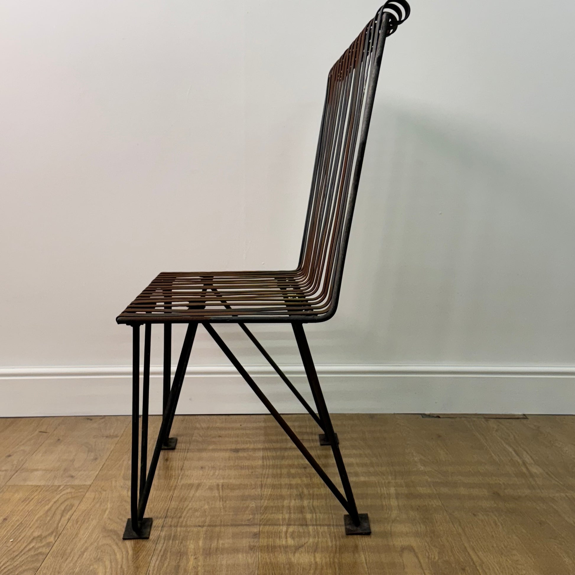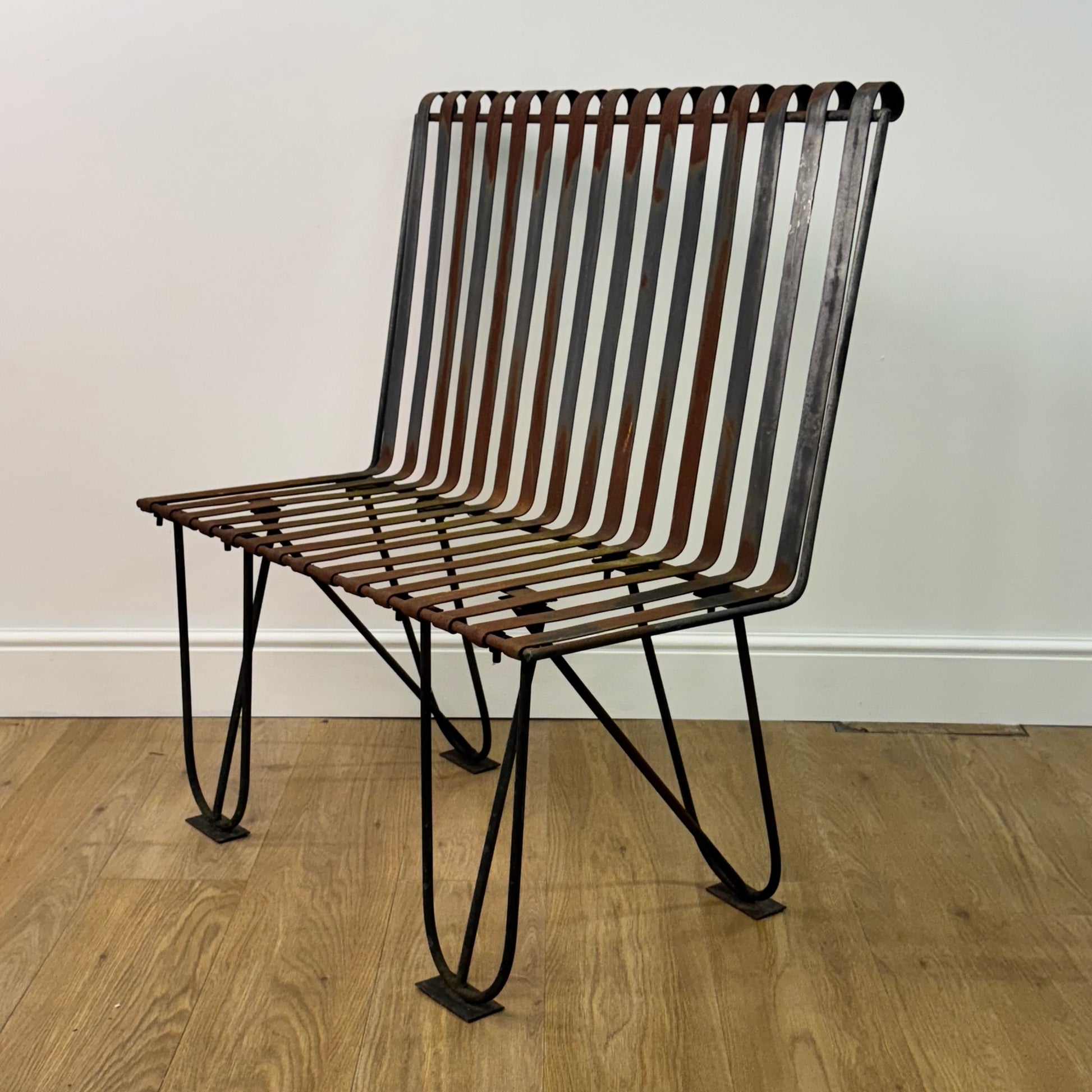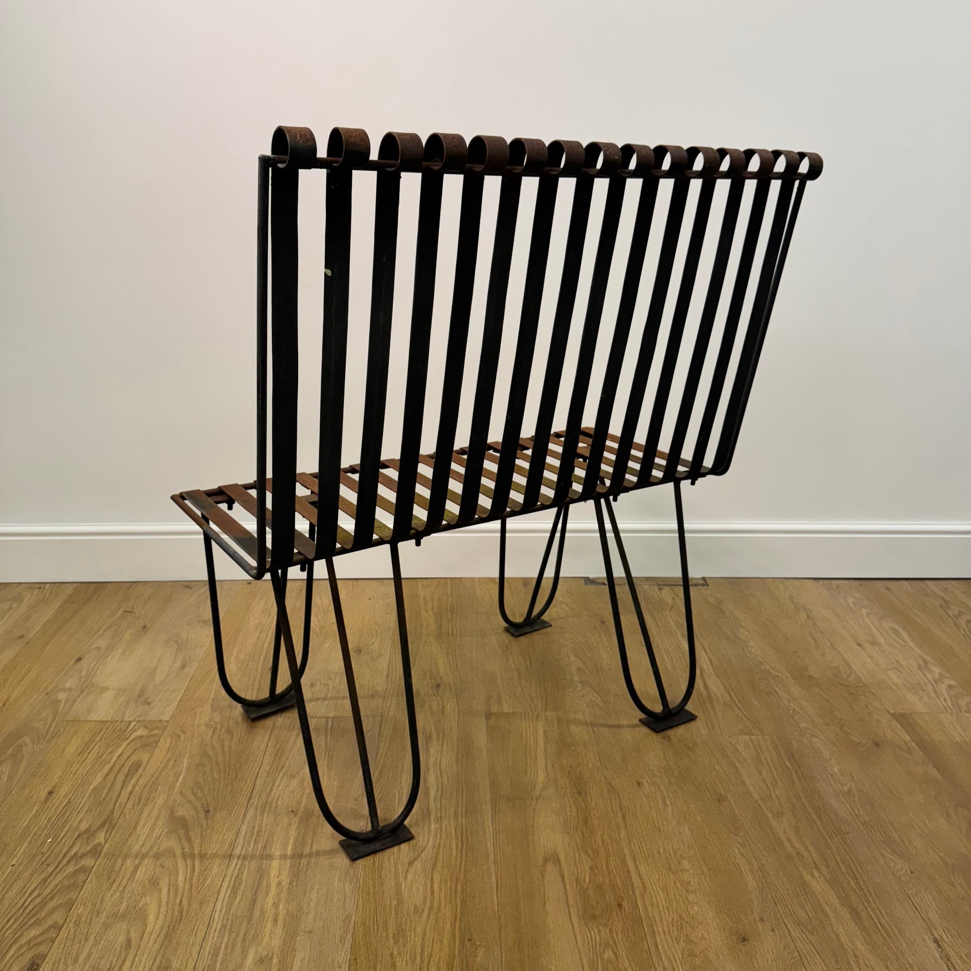 An unusual small galvanised slatted steel bench on hairpin style legs