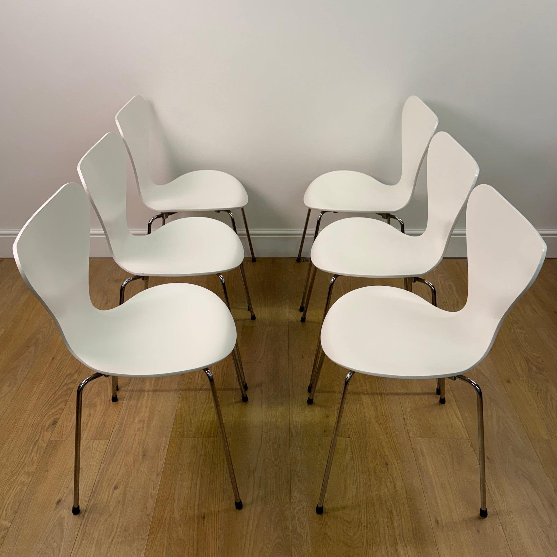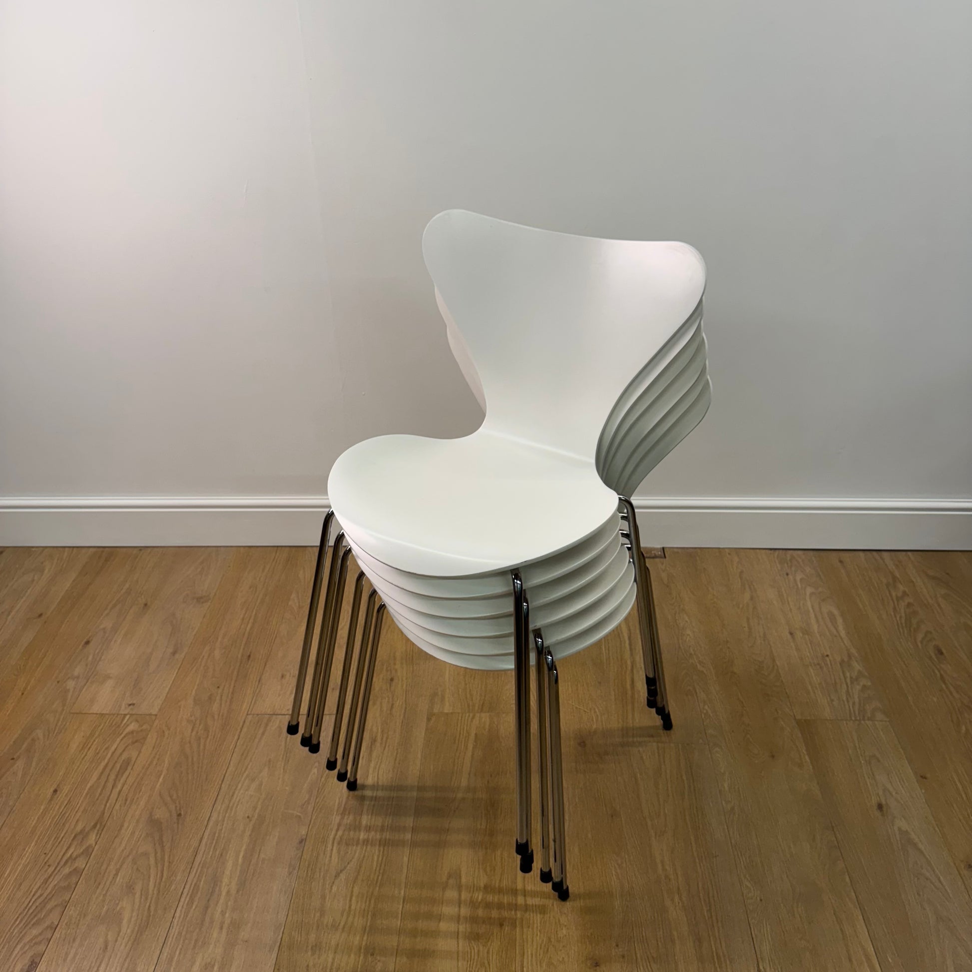 A set of 6 white series 7 chair designed by Arne jacobsen for Fritz Hansen Denmark