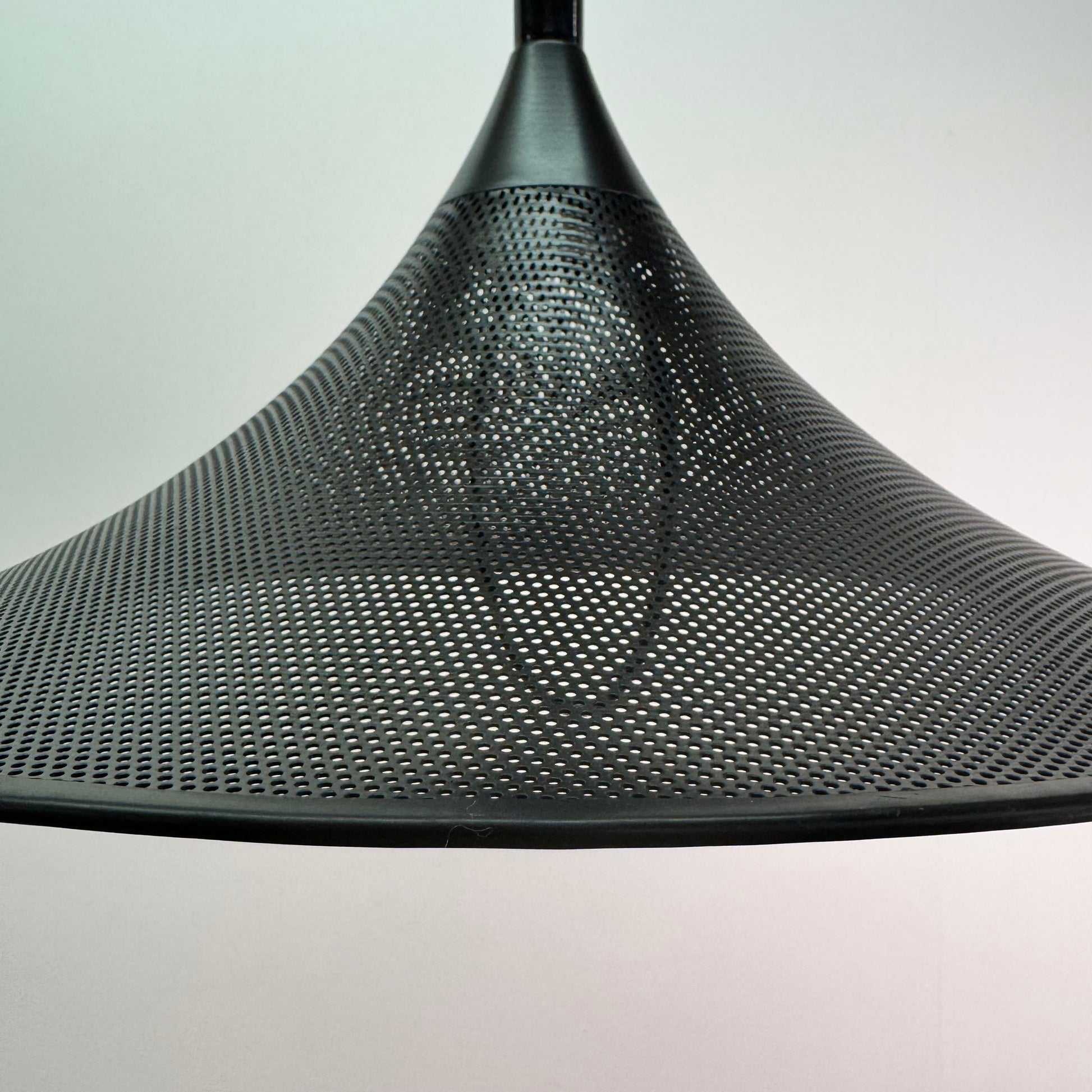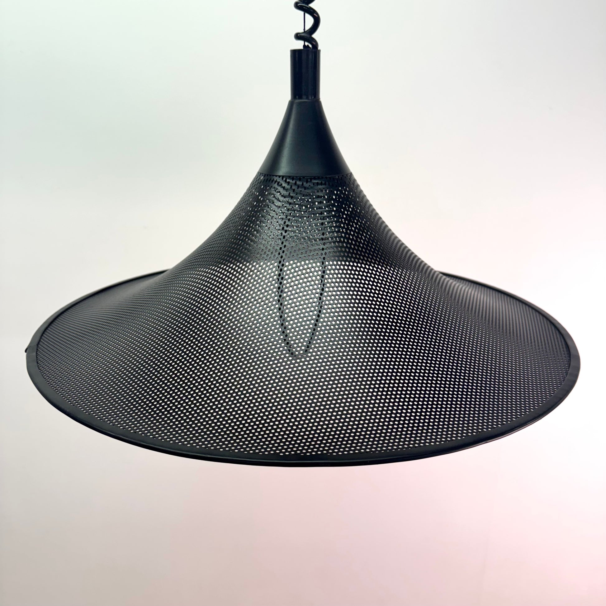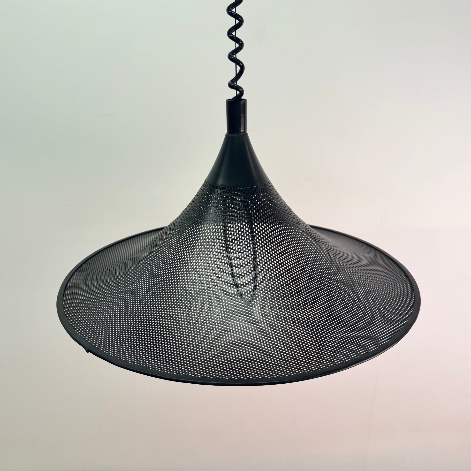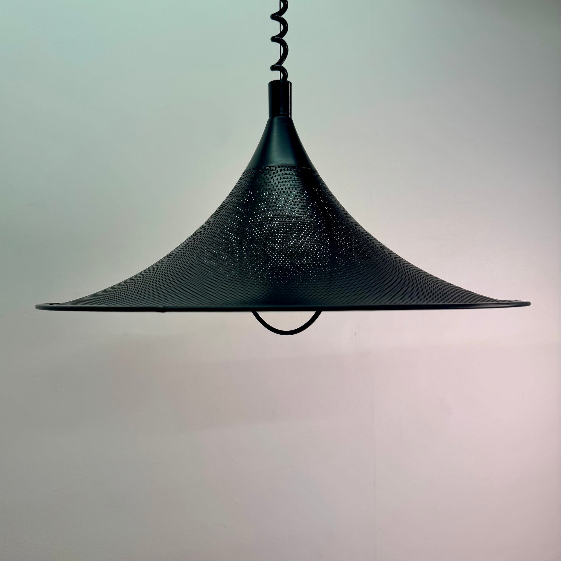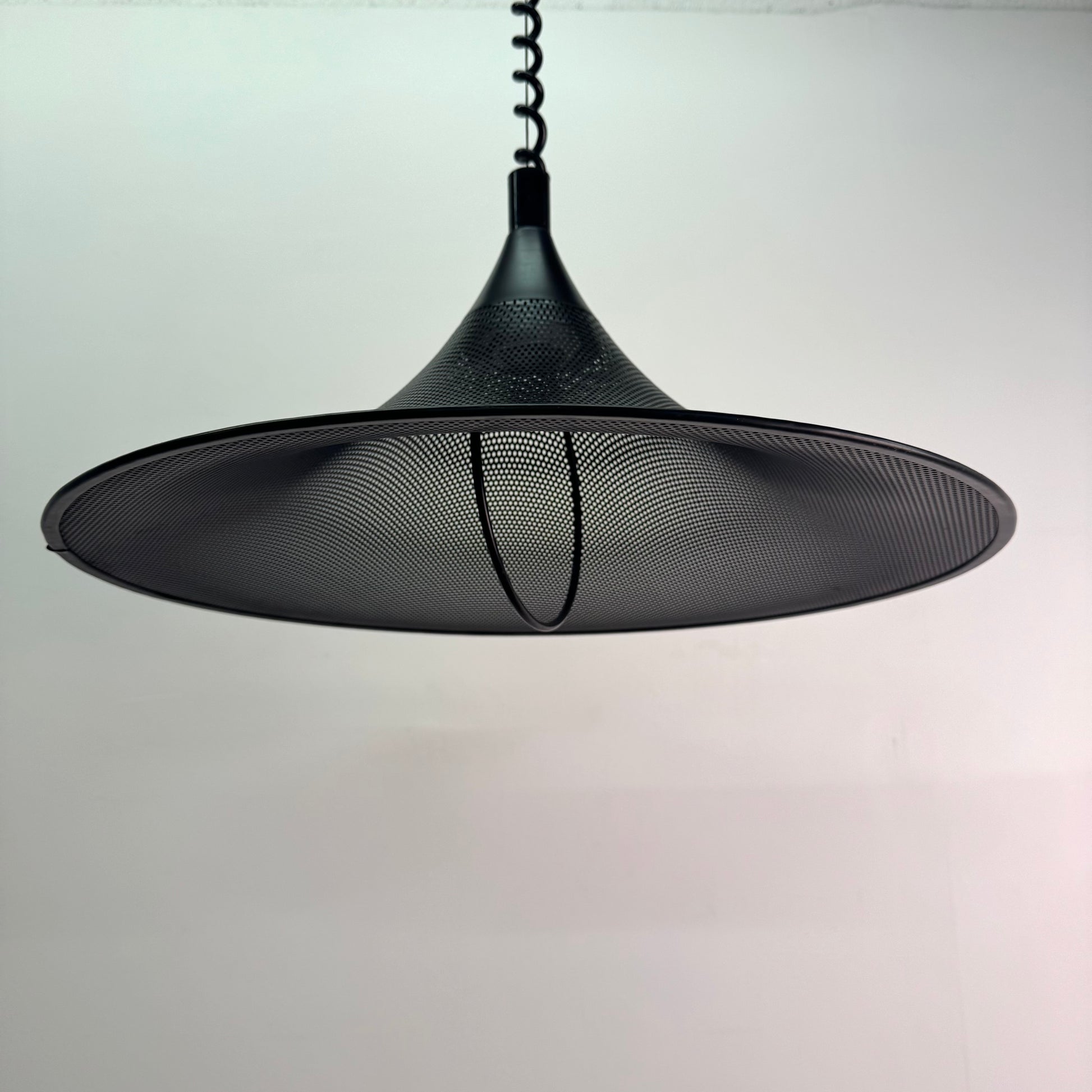 A pierced black metal rise and fall pendant lamp suitable for over a table