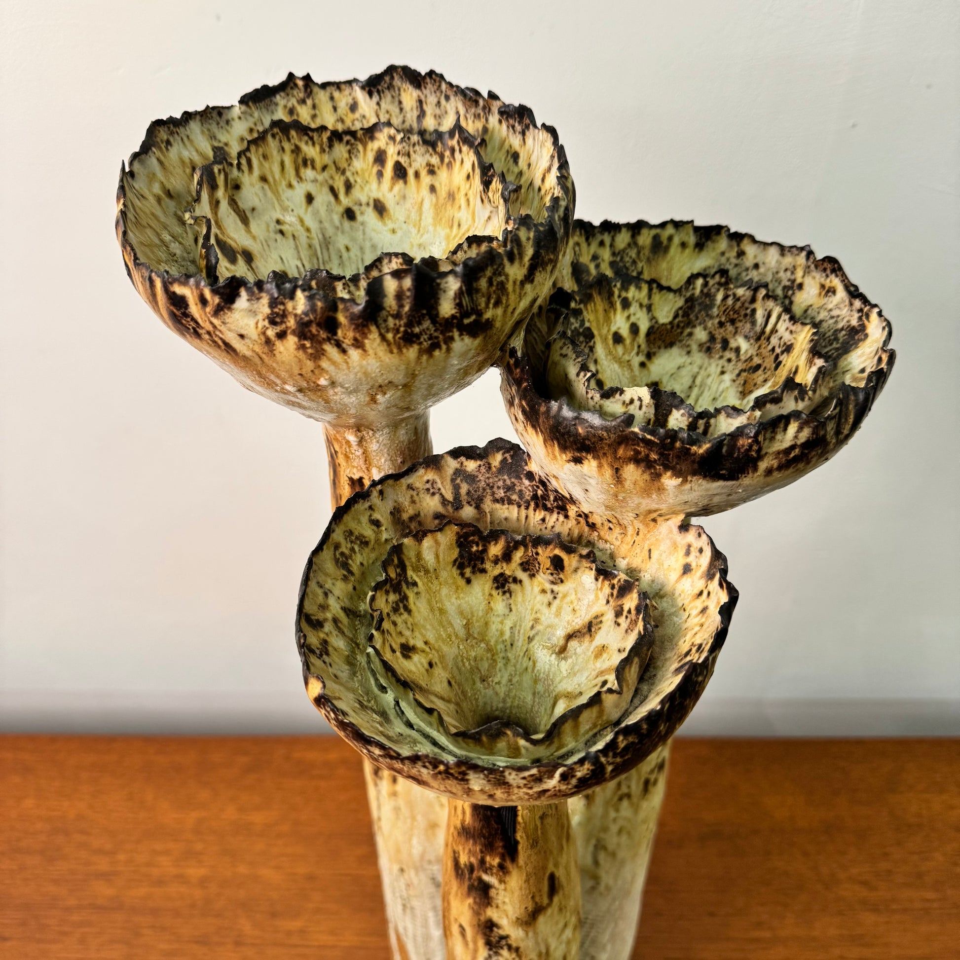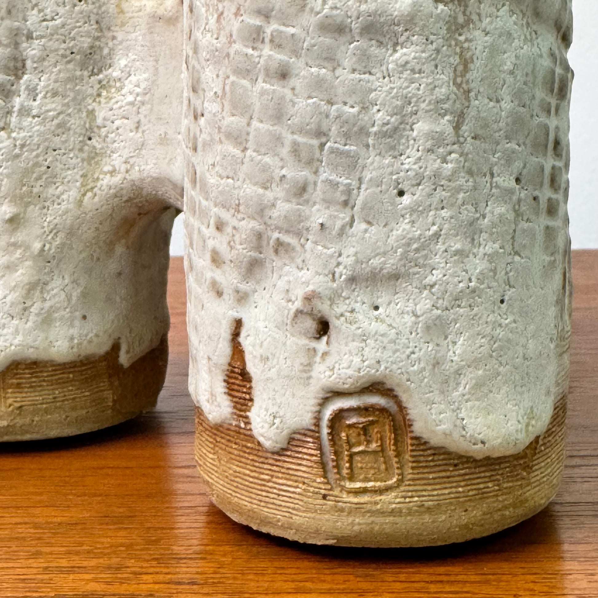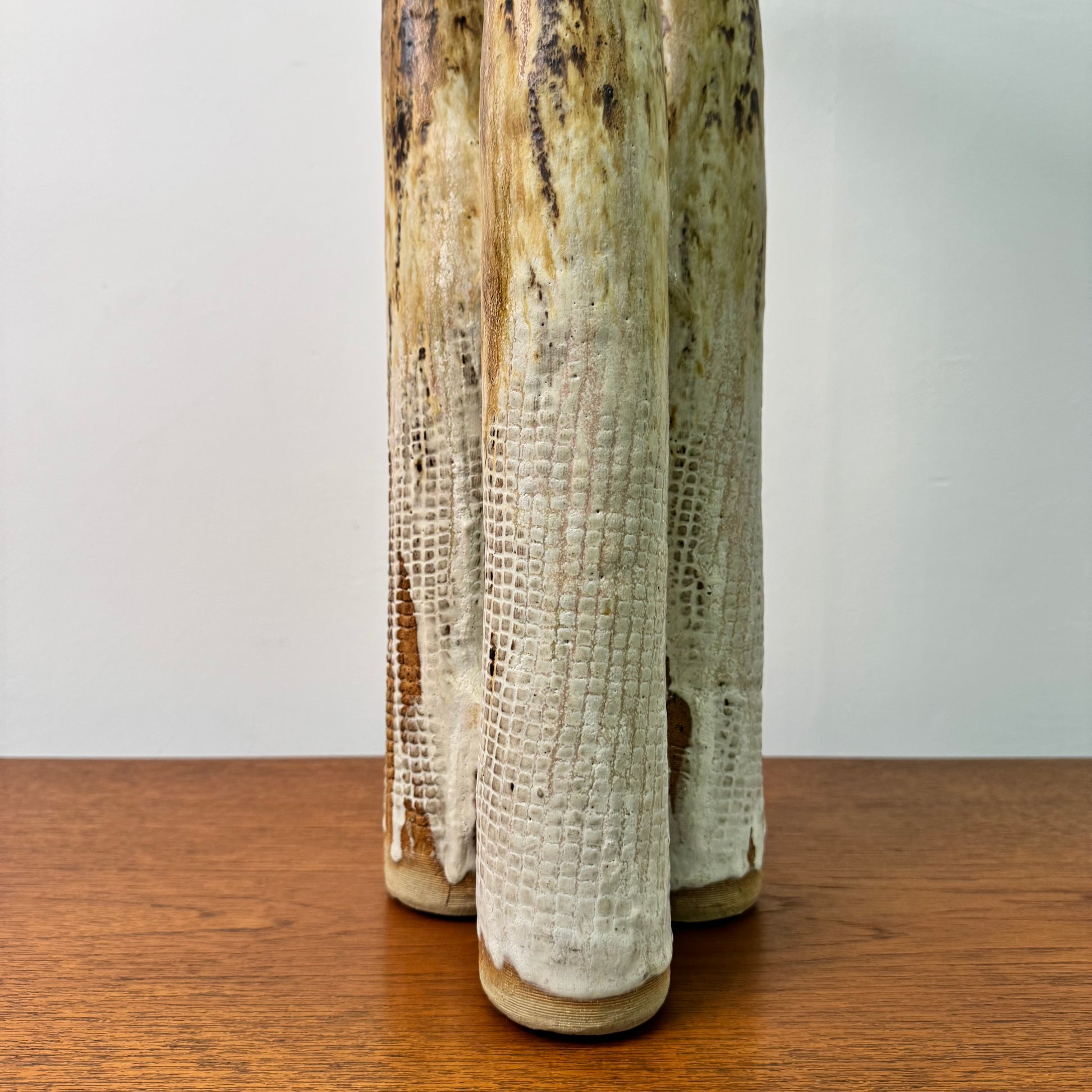 An interesting brutalist style slab built vase with impressed decoration and pinched tops