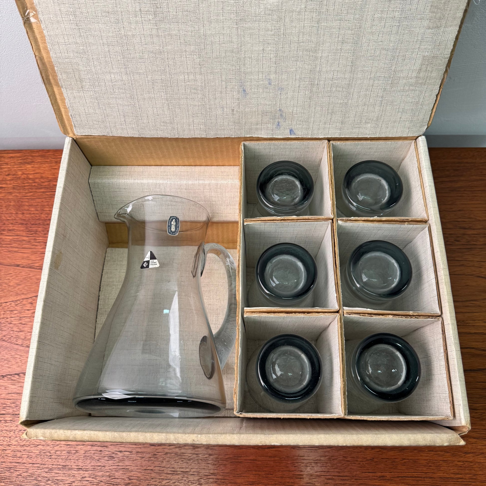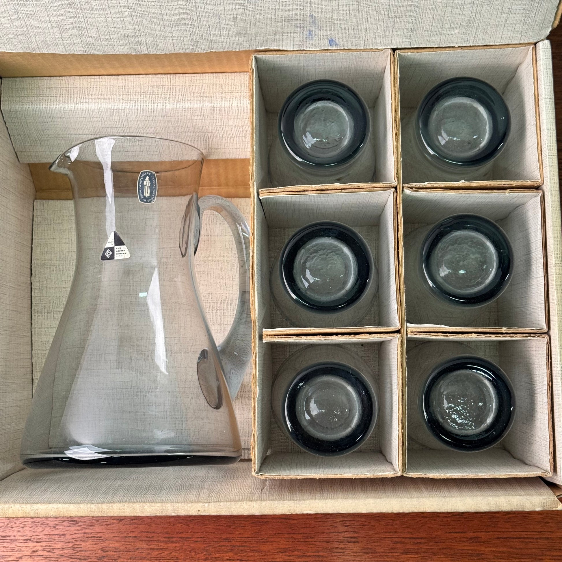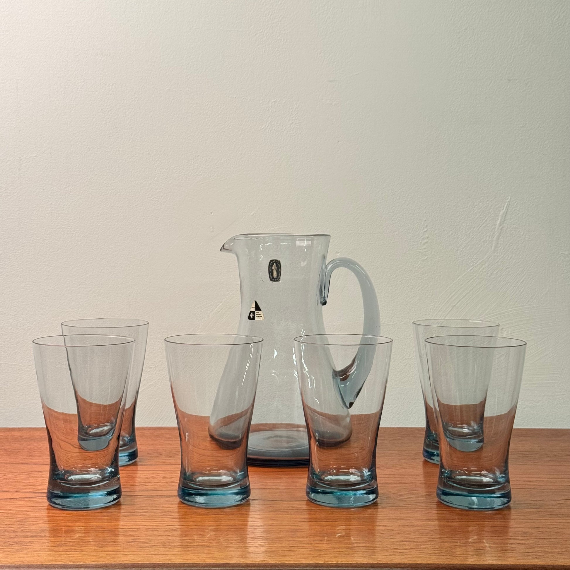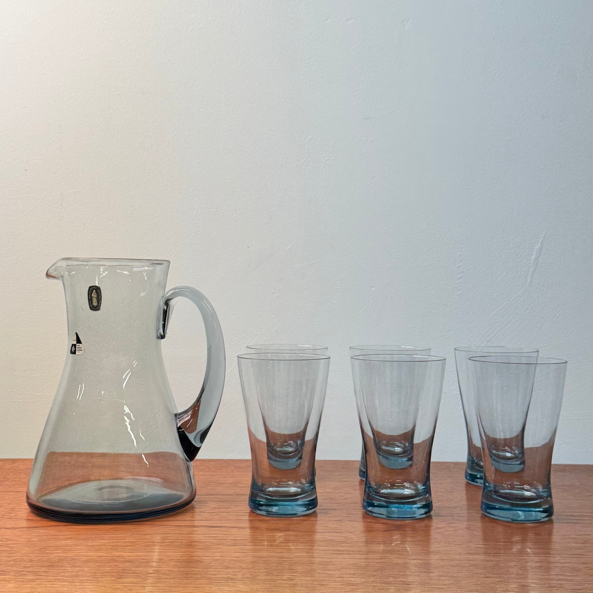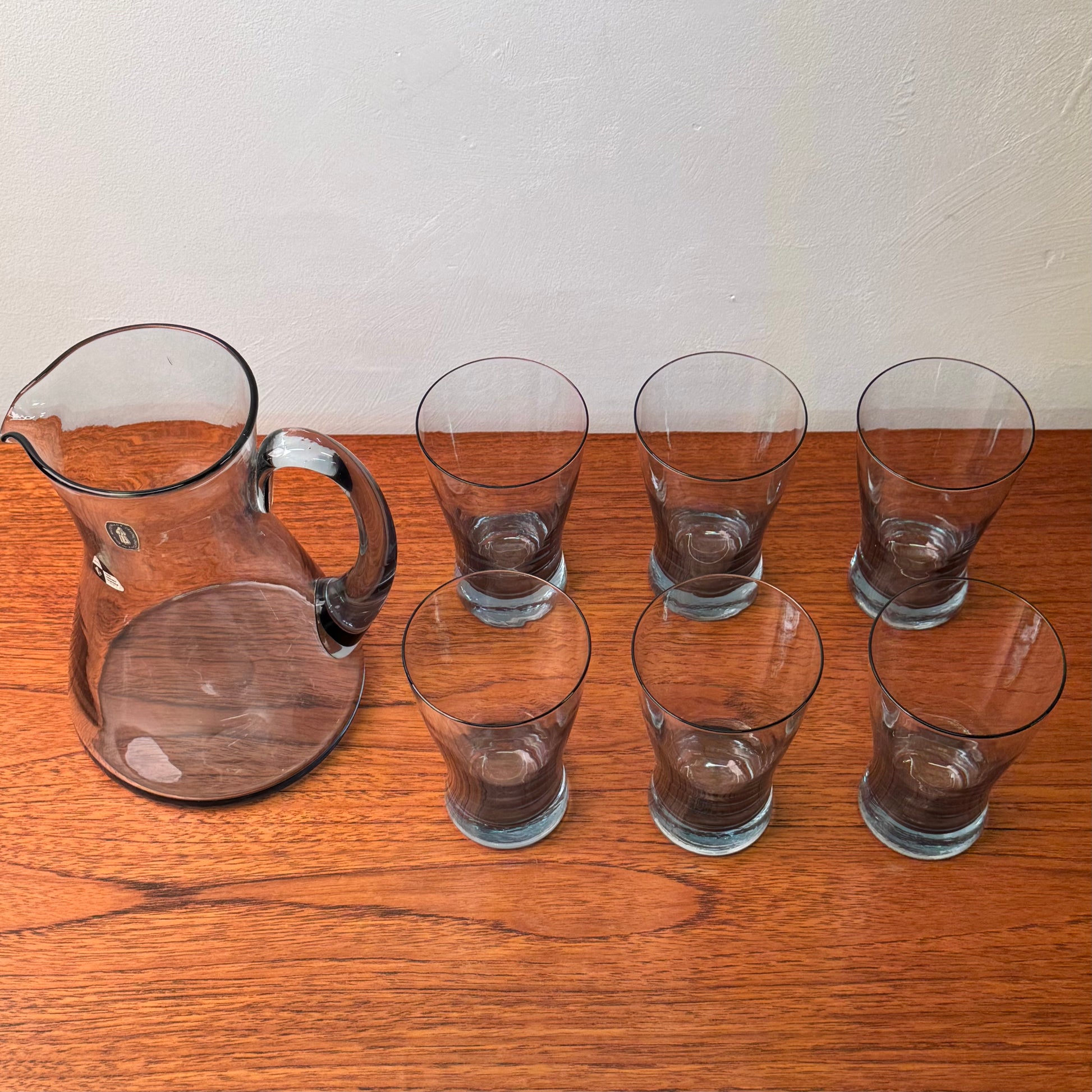 A Water jug and 6 glasses designed by William Wilson for Whitefriars glass 1960s.