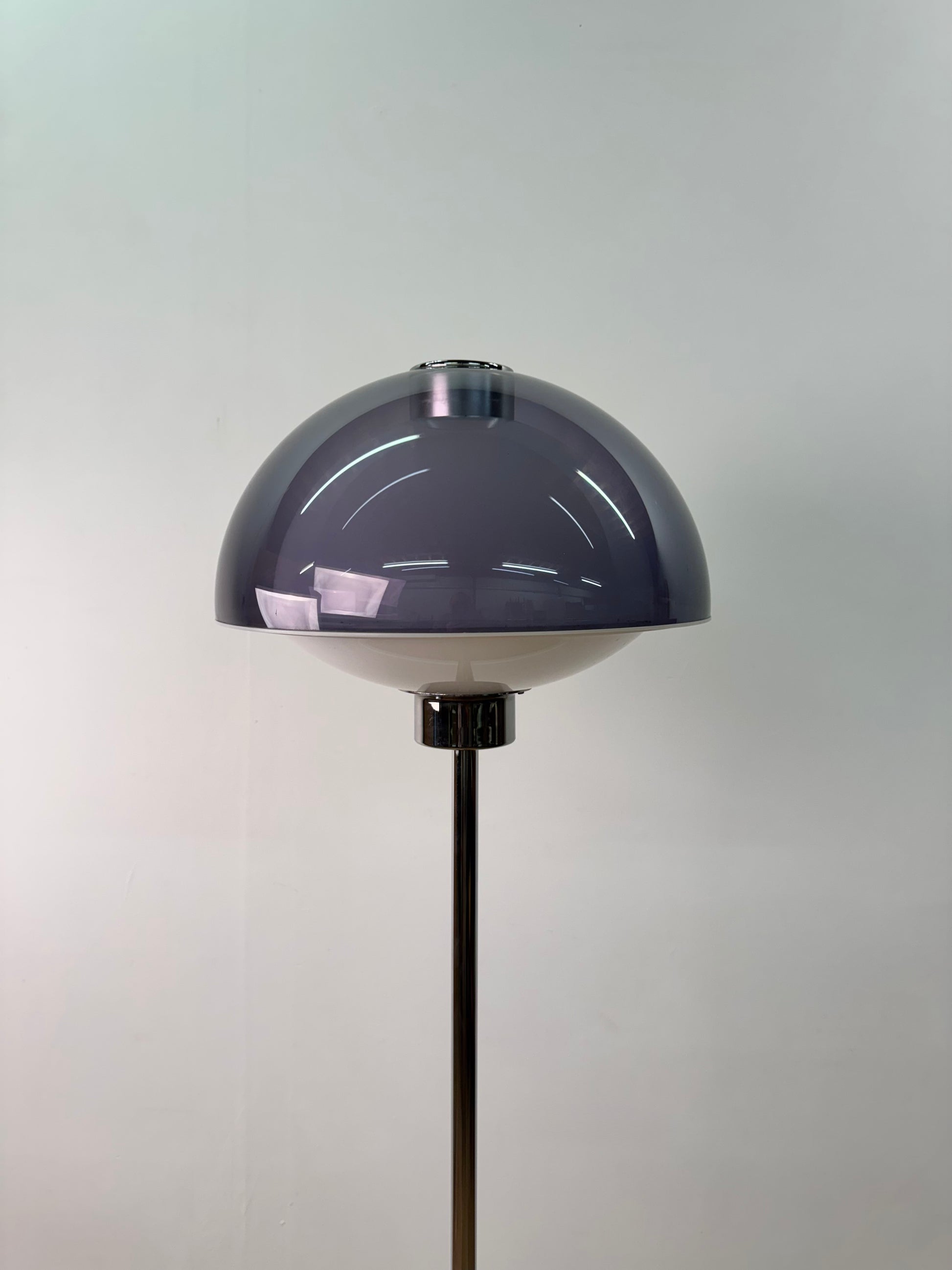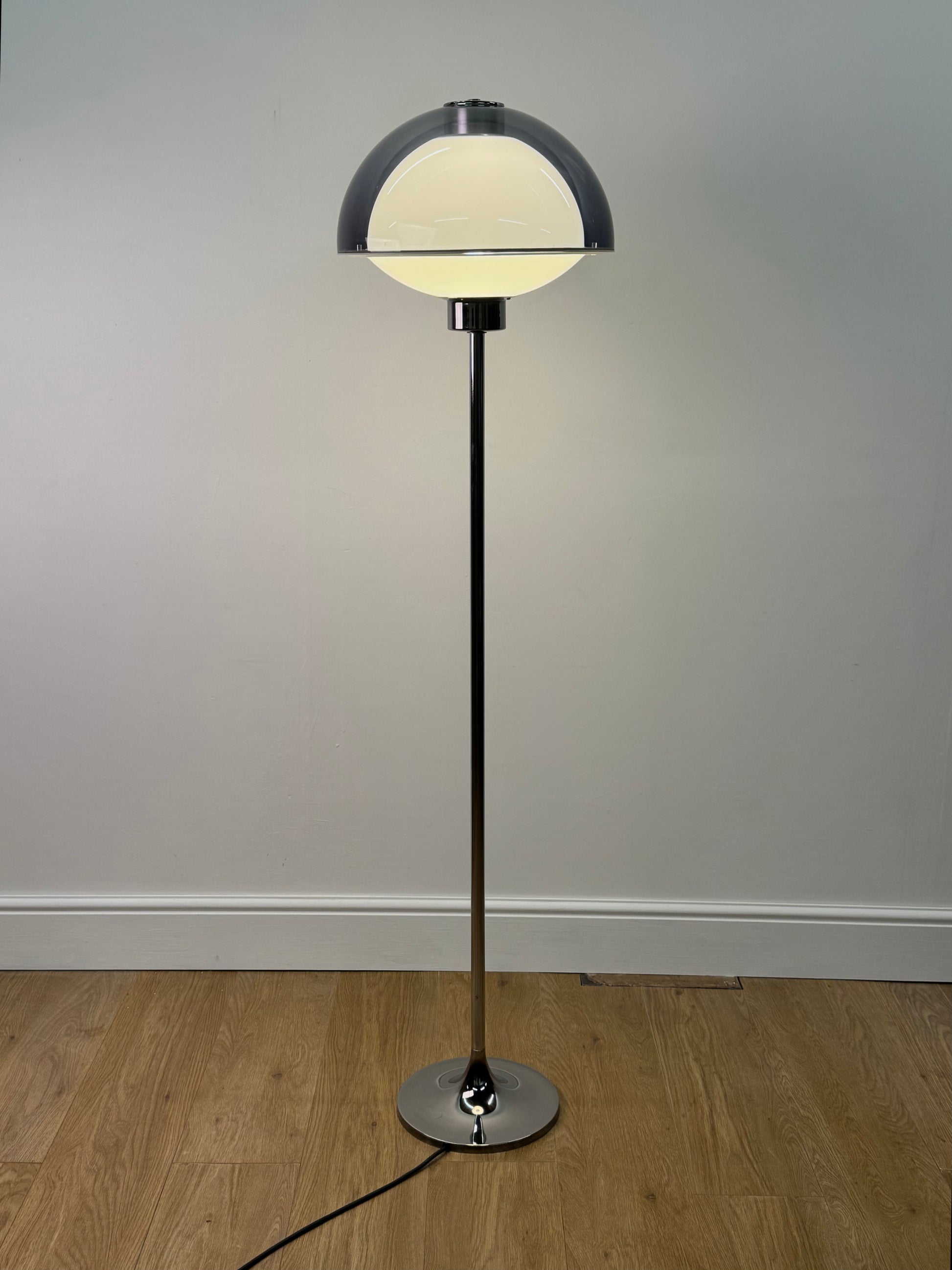 The shade is made from two domes of opal acrylic with an outer dome of smoked grey acrylic