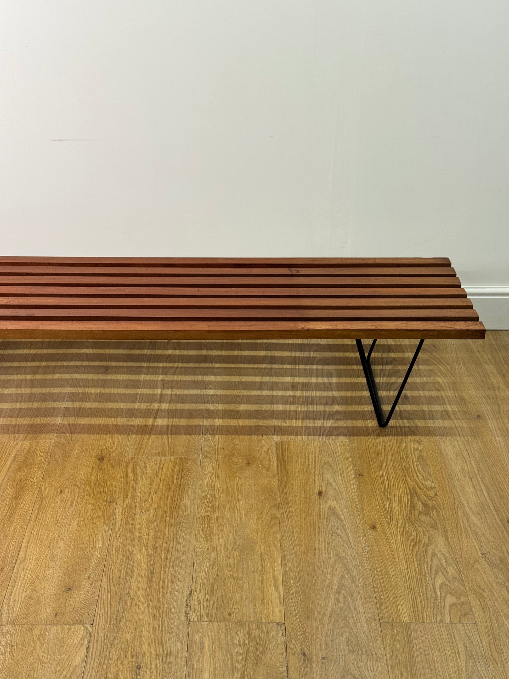 A 1950s mahogany slatted bench on black painted v shaped steel legs