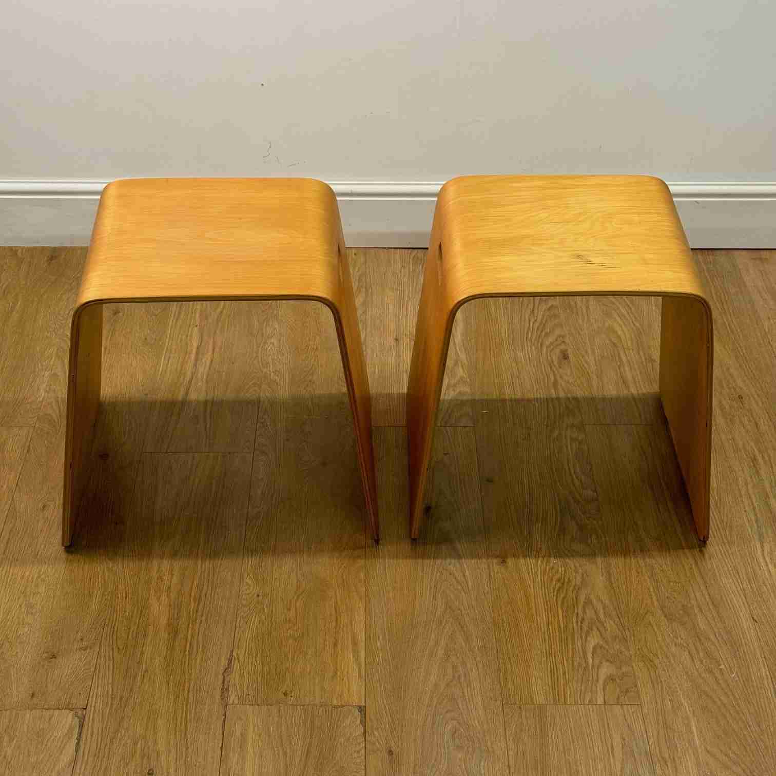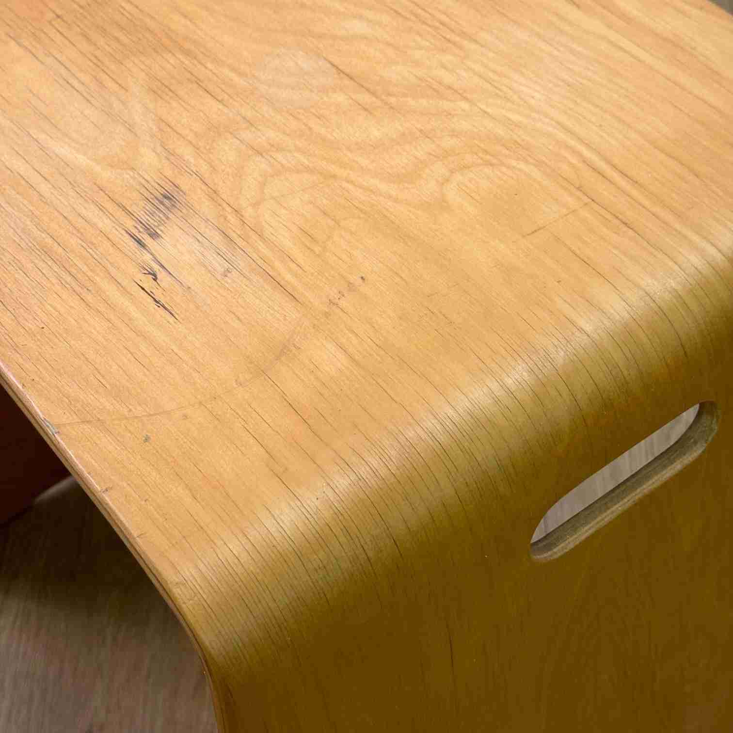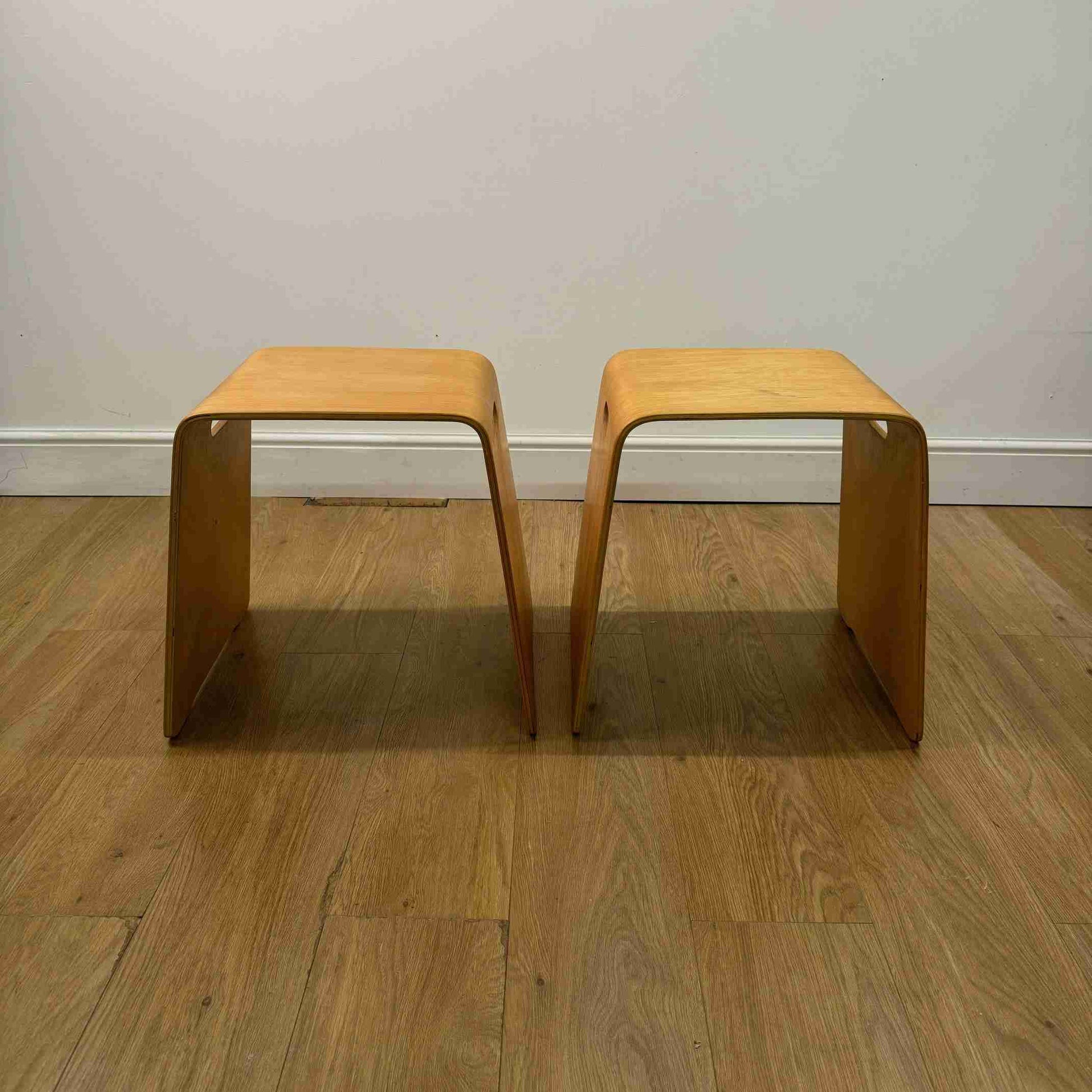 A pair of bent birch ply tables/stools with pieced hand hole detail