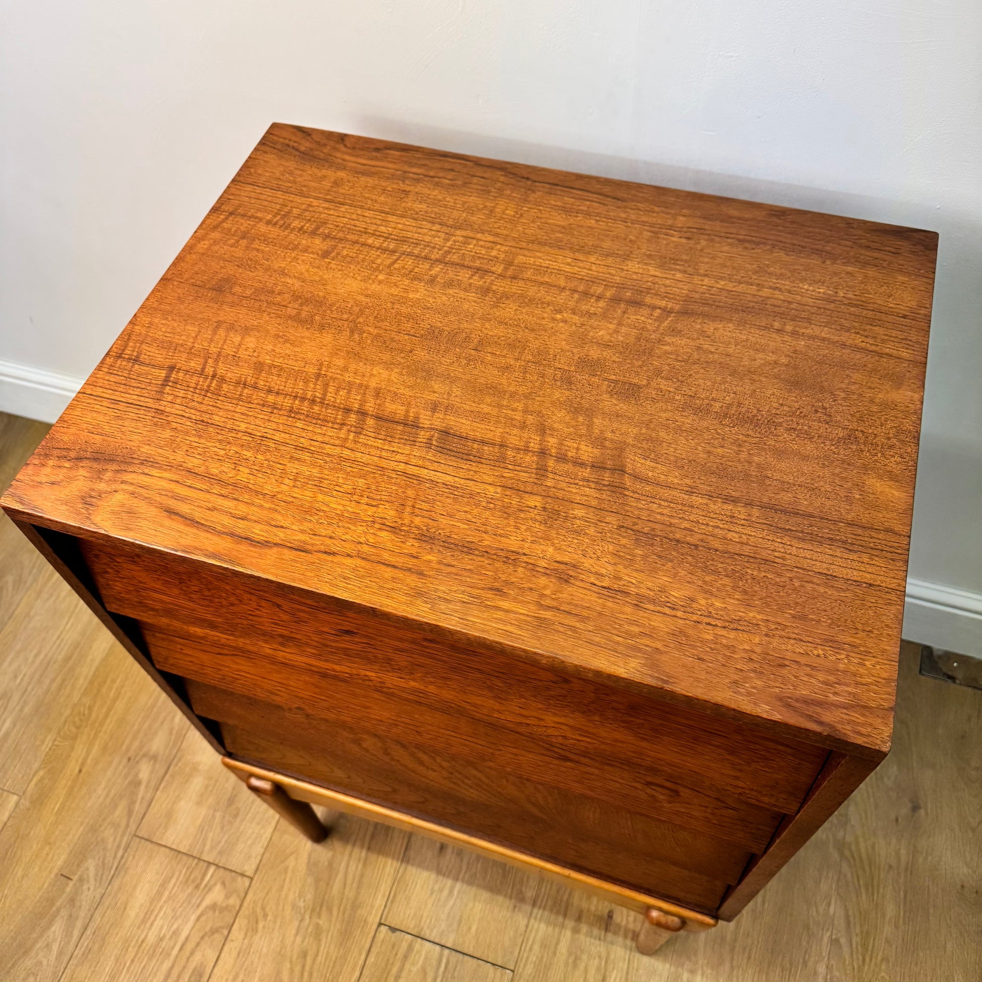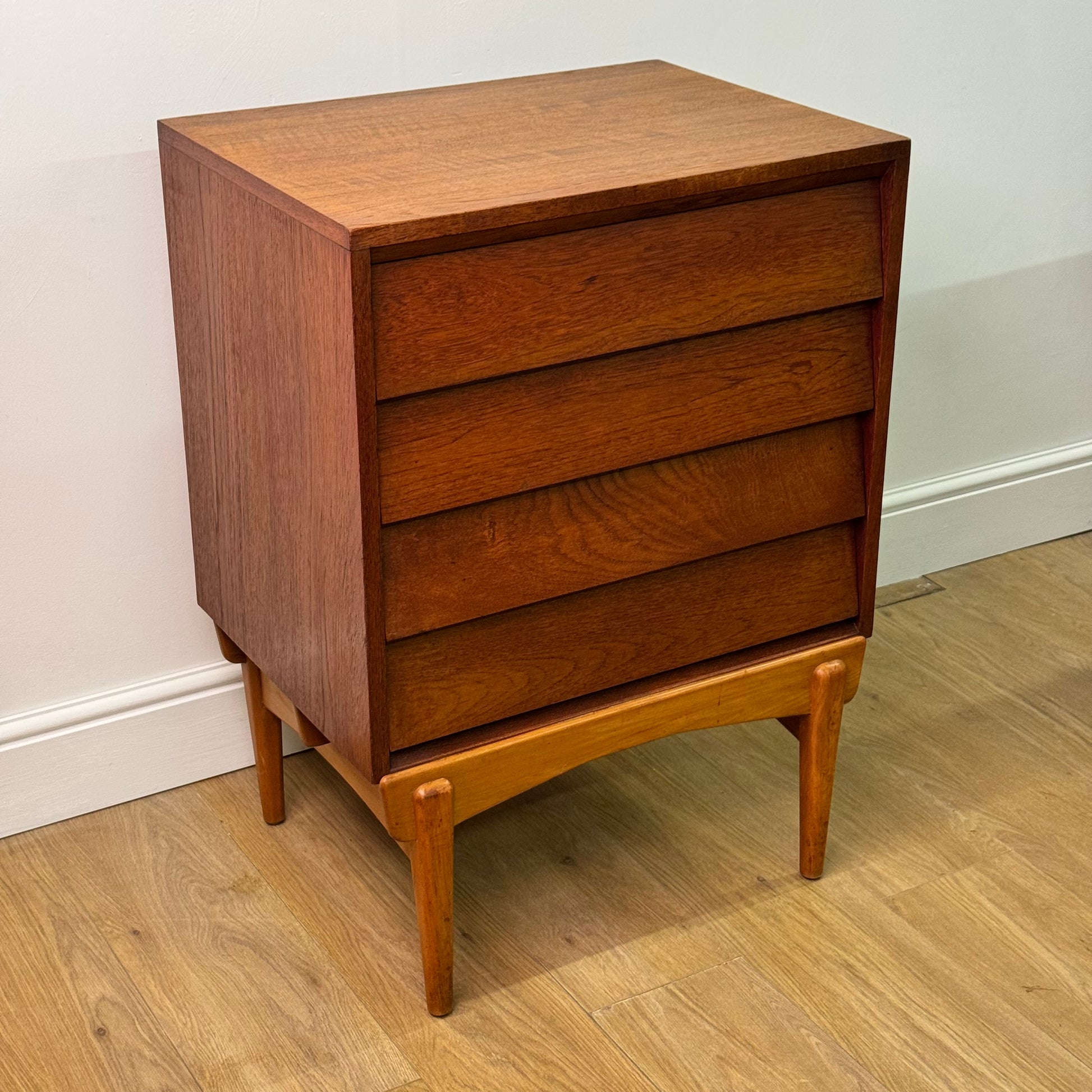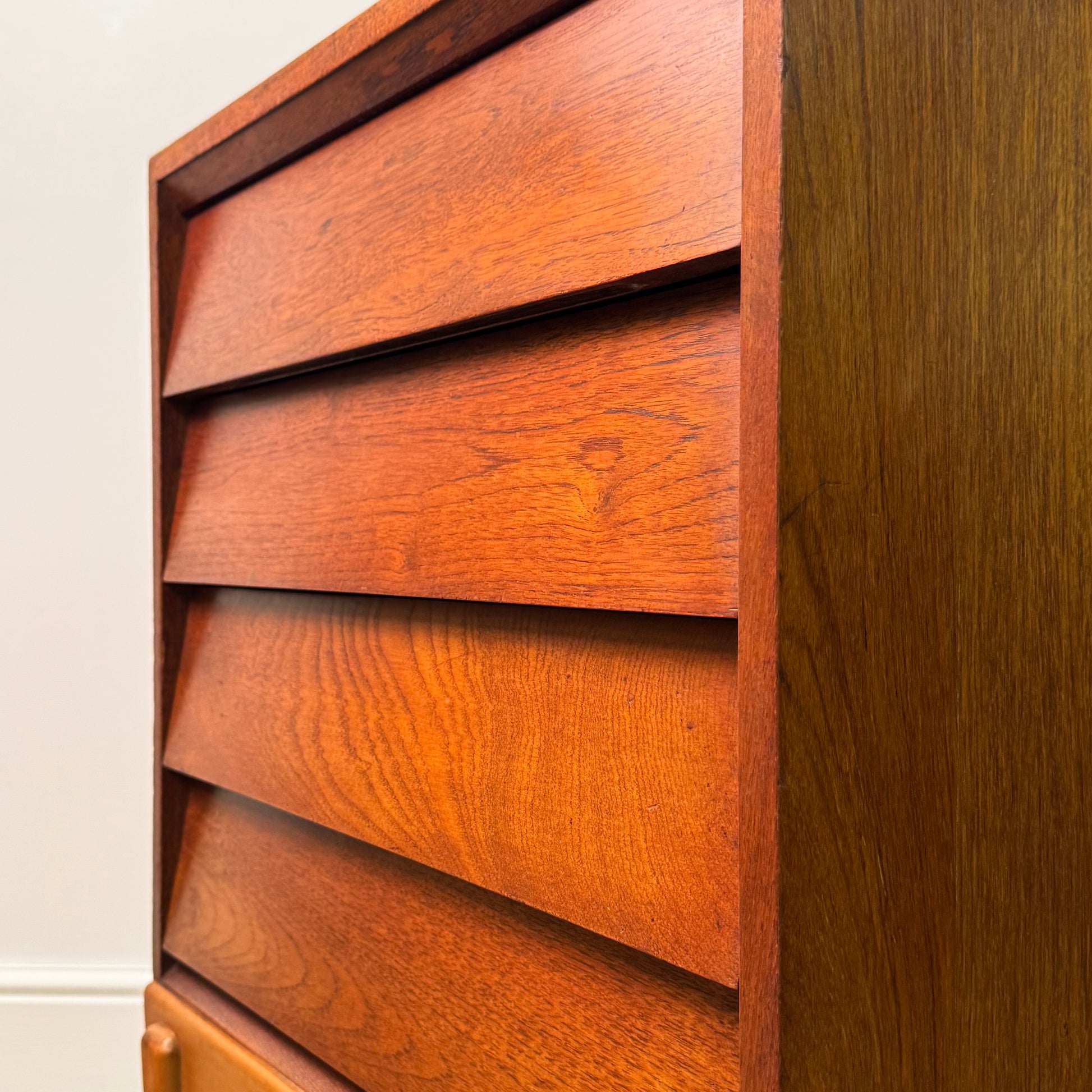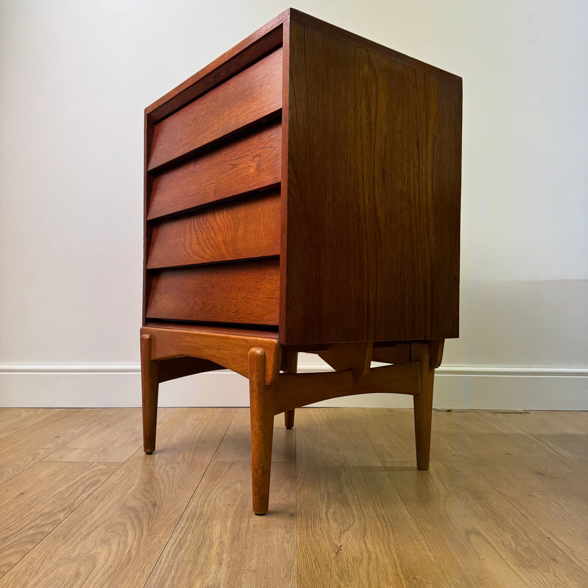 An unusual small teak chest of drawers with a louvered style front standing on beech legs.