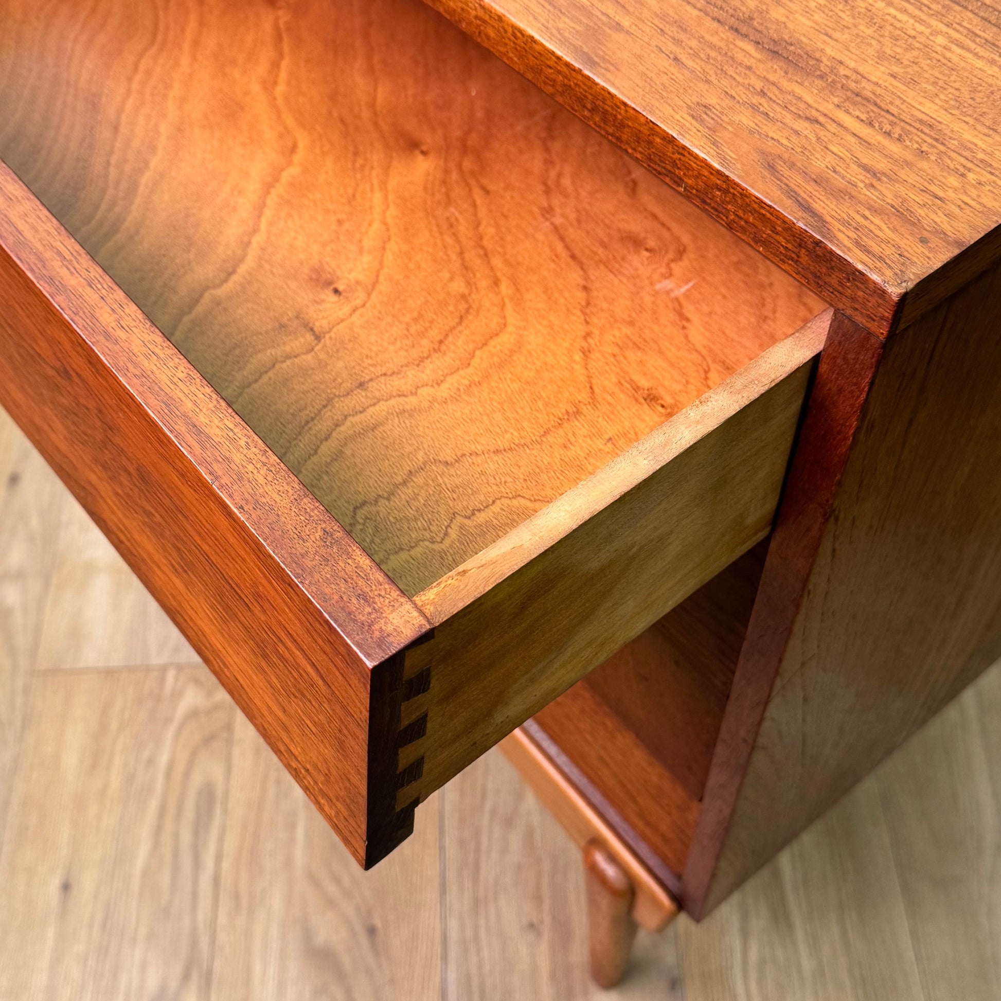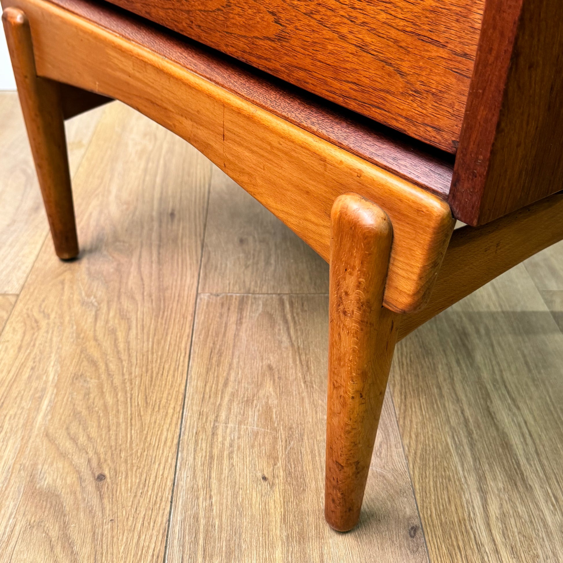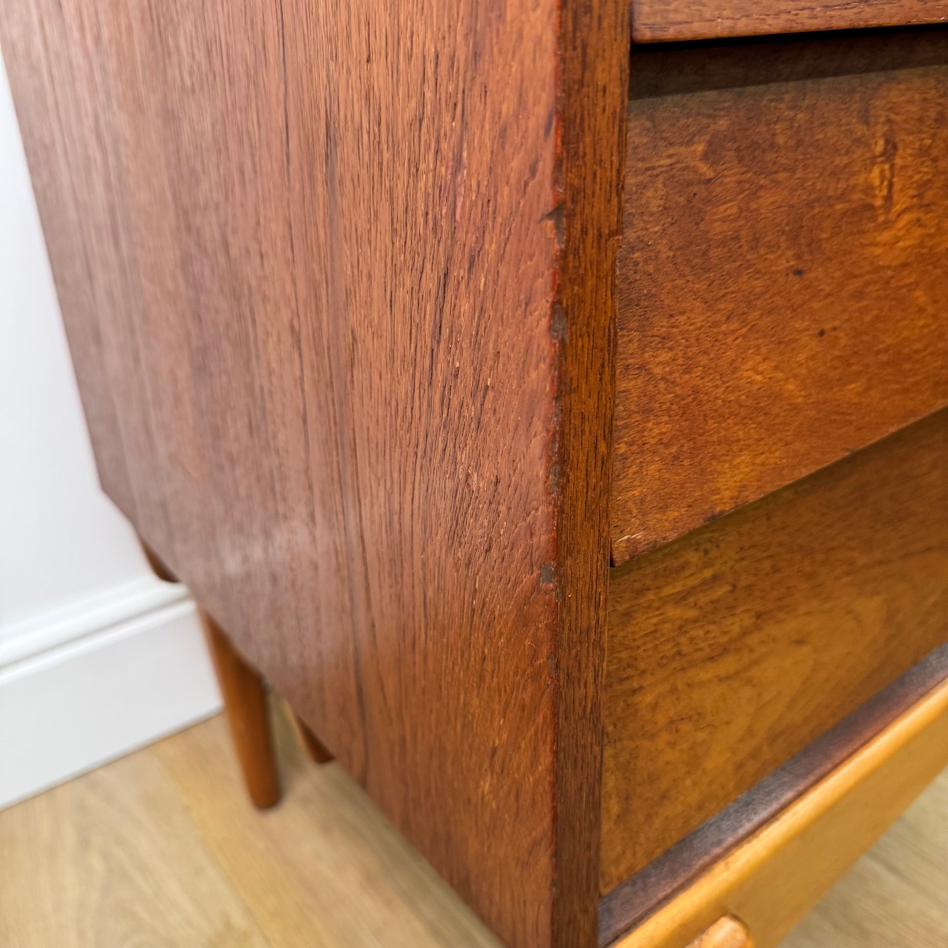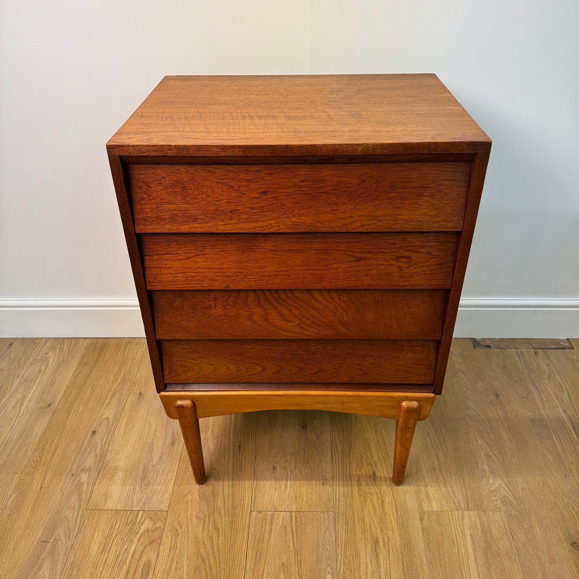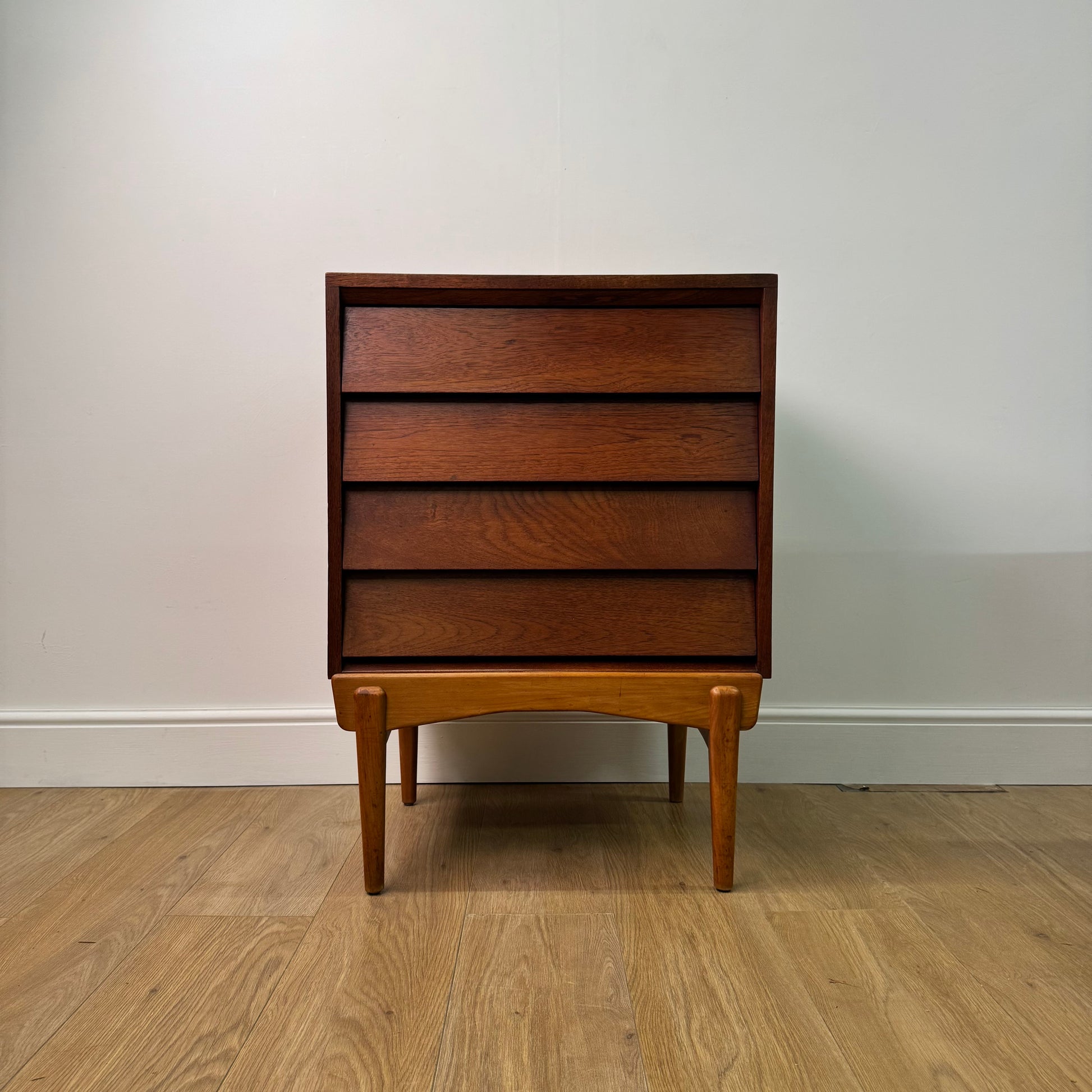 An unusual small teak chest of drawers with a louvered style front standing on beech legs.