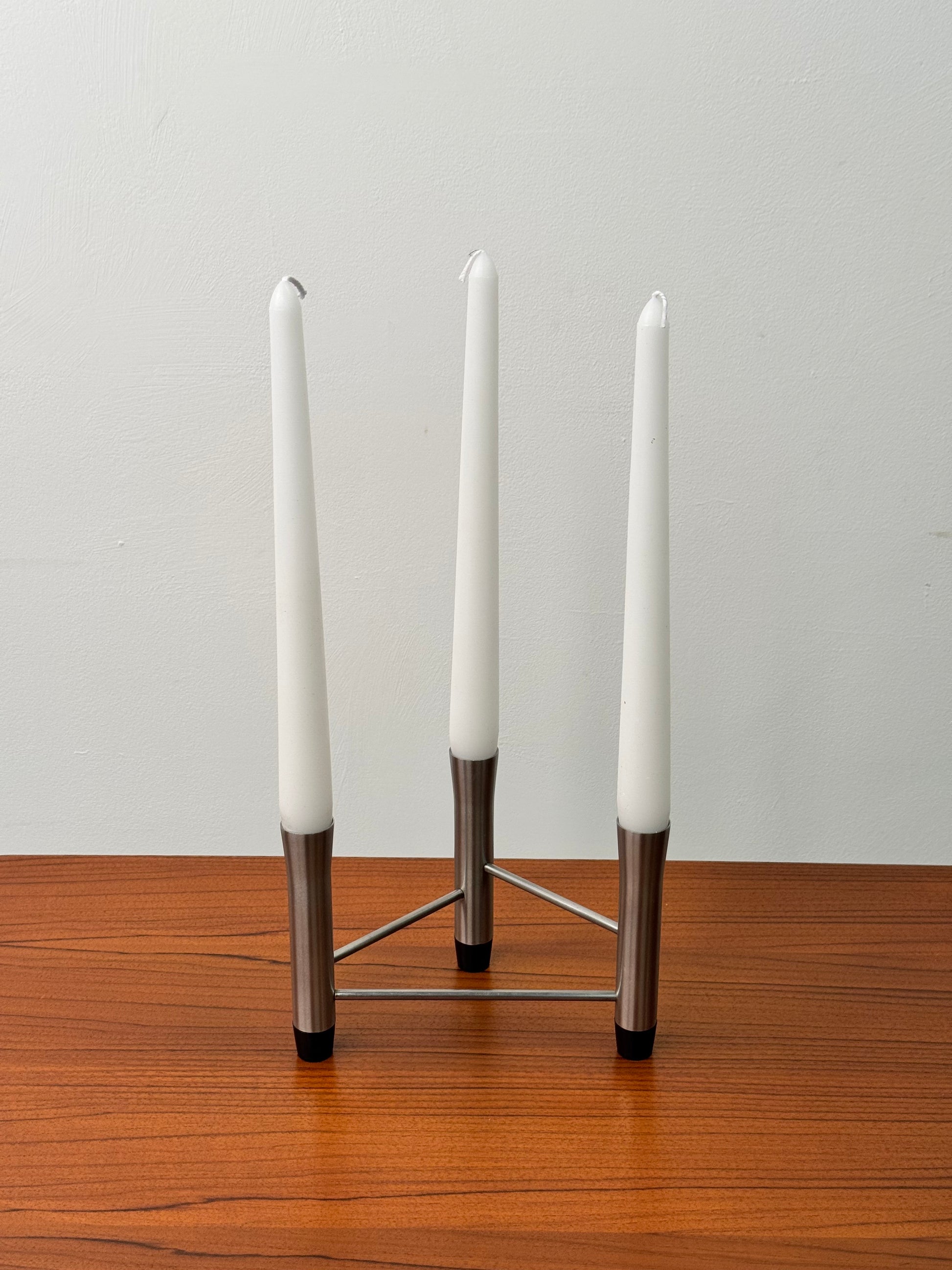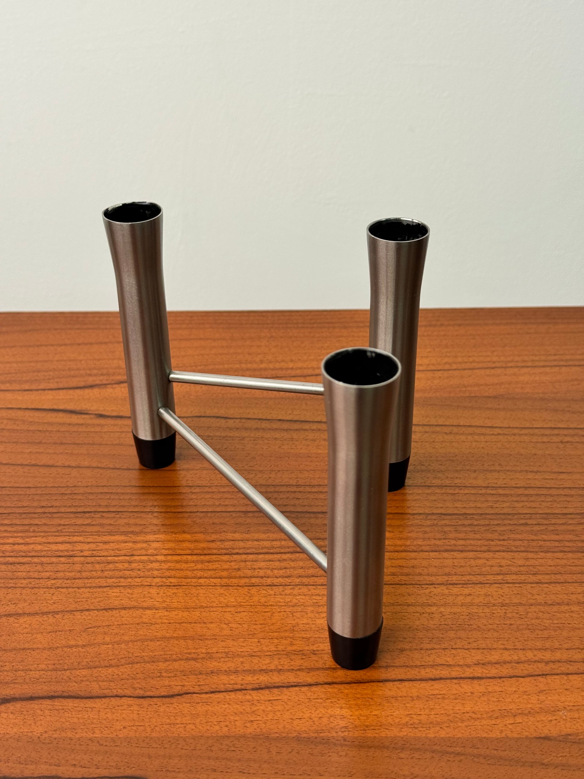 A 1970s stainless steel modernist 3 prong candlestick